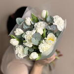 Тюльпан - 8 шт. Лента атласная - 1 шт. Диантус - 5 шт. Упаковка дизайнерская - 1 шт. Эвкалипт Цинерея - 5 шт.