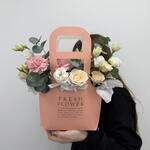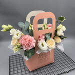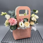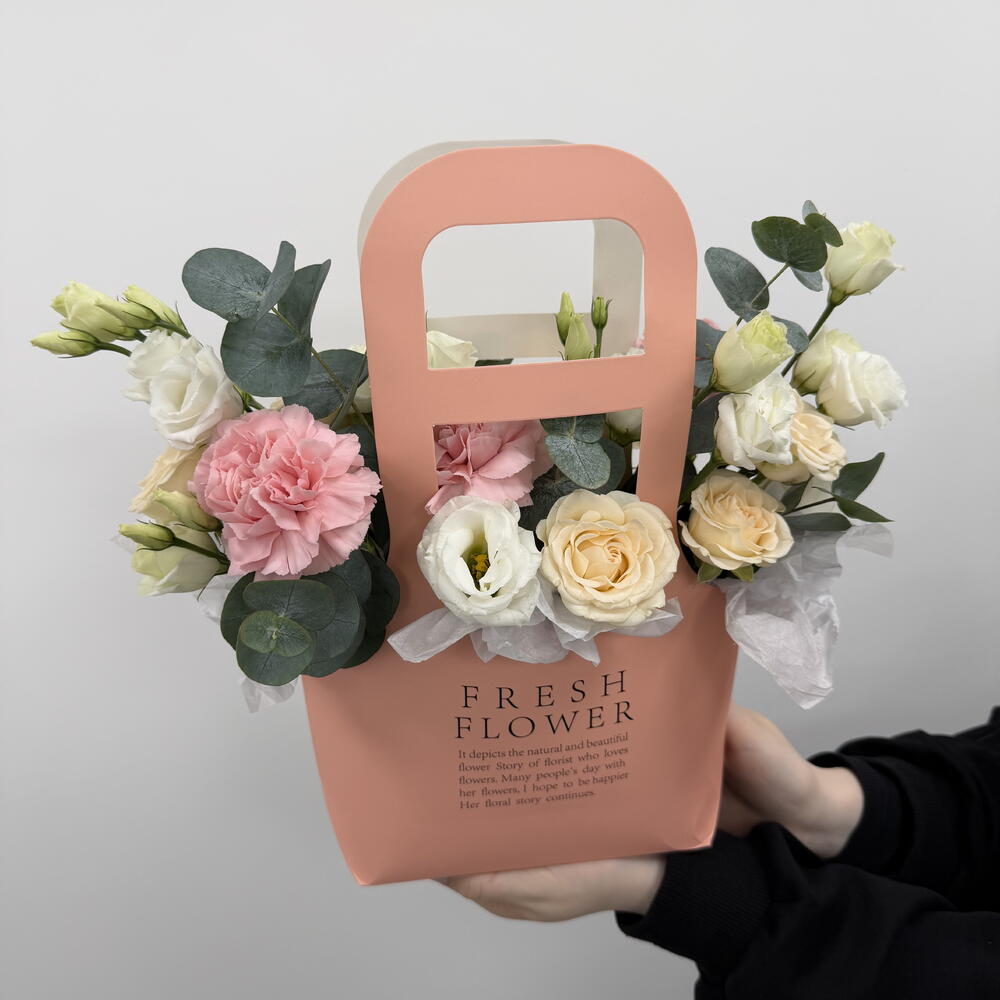 Эвкалипт - 2 шт. Кустовая роза - 2 шт. Эустома - 2 шт. Диантус - 2 шт. Оазис - 2 шт. Сумочка - 1 шт. тишью бумага - 1 шт.