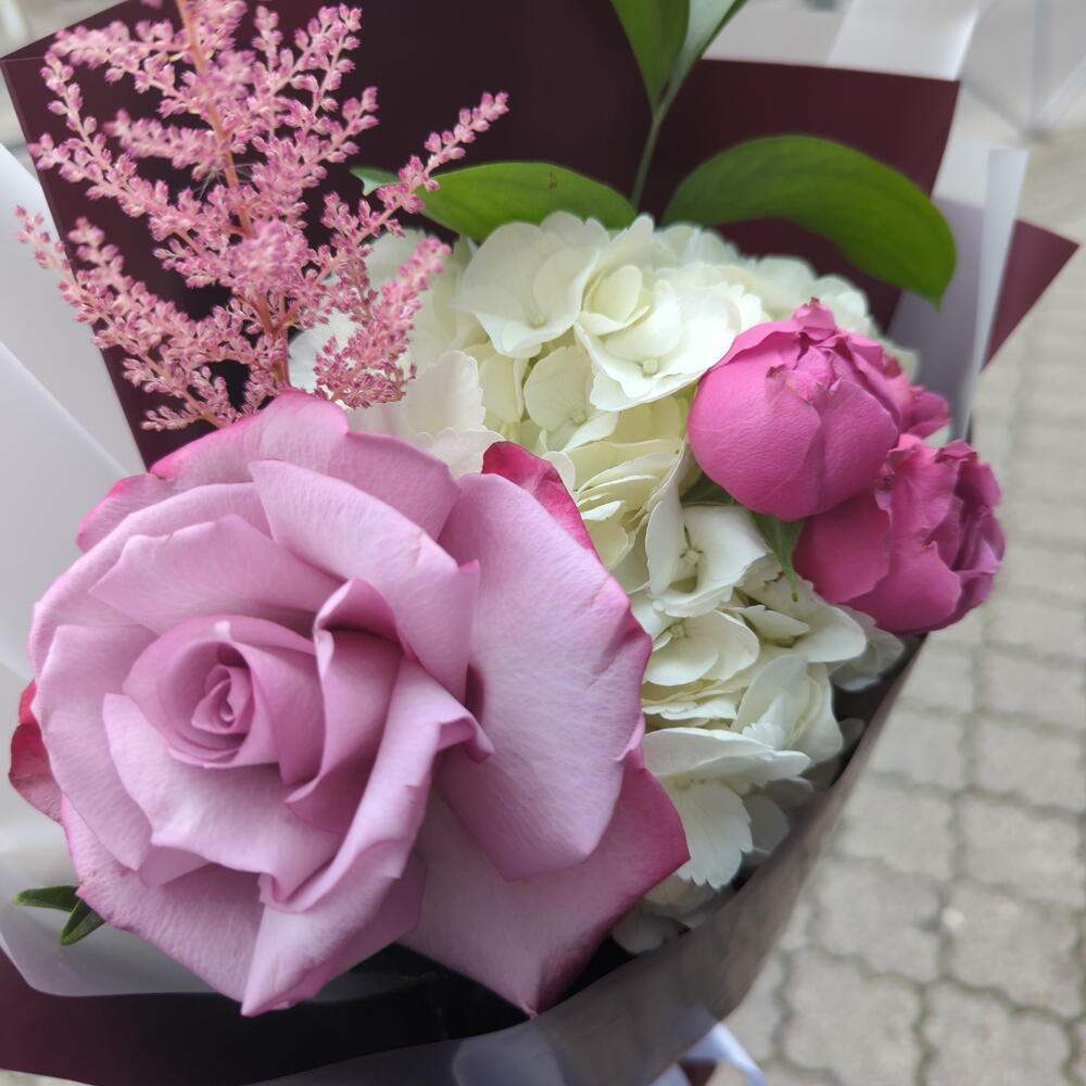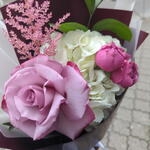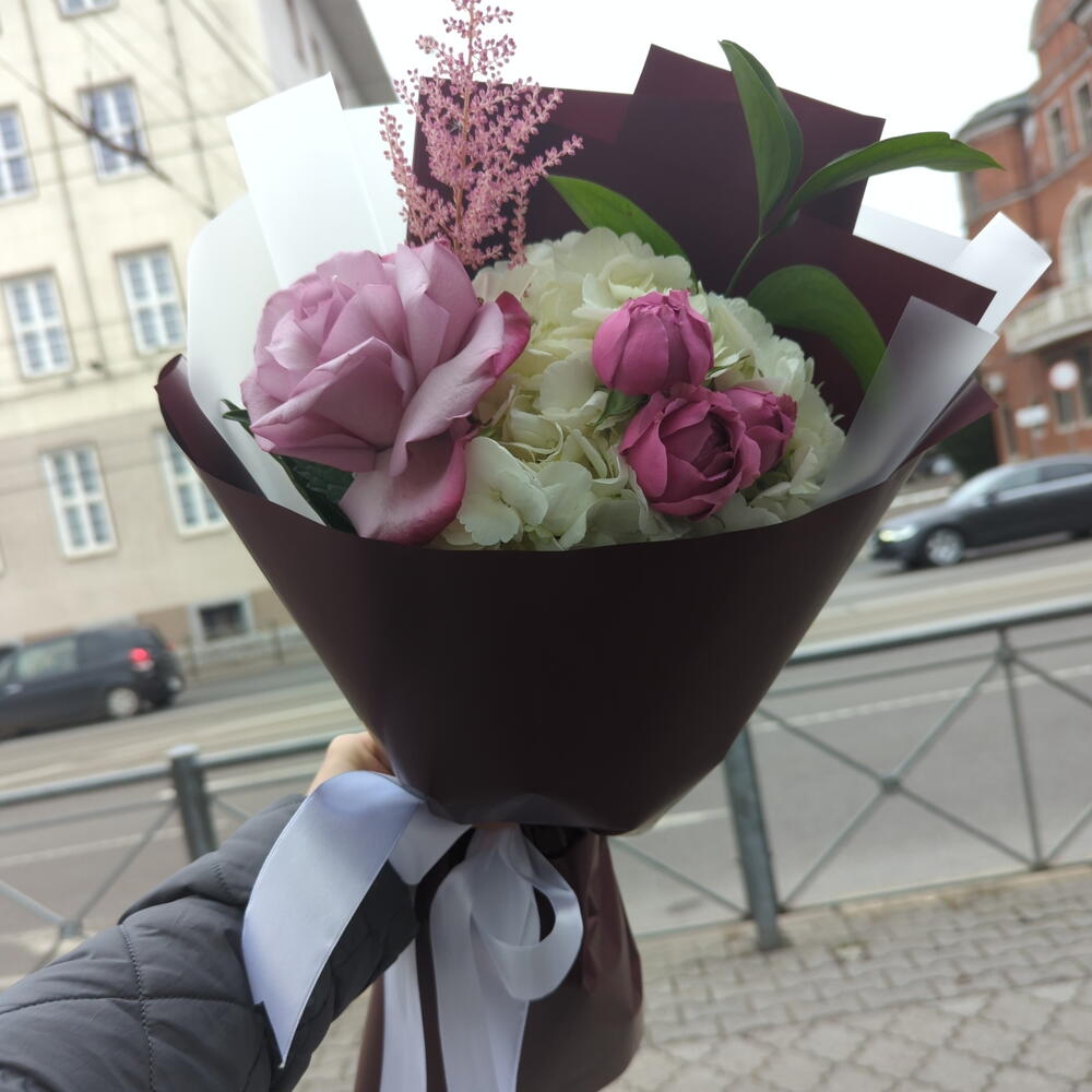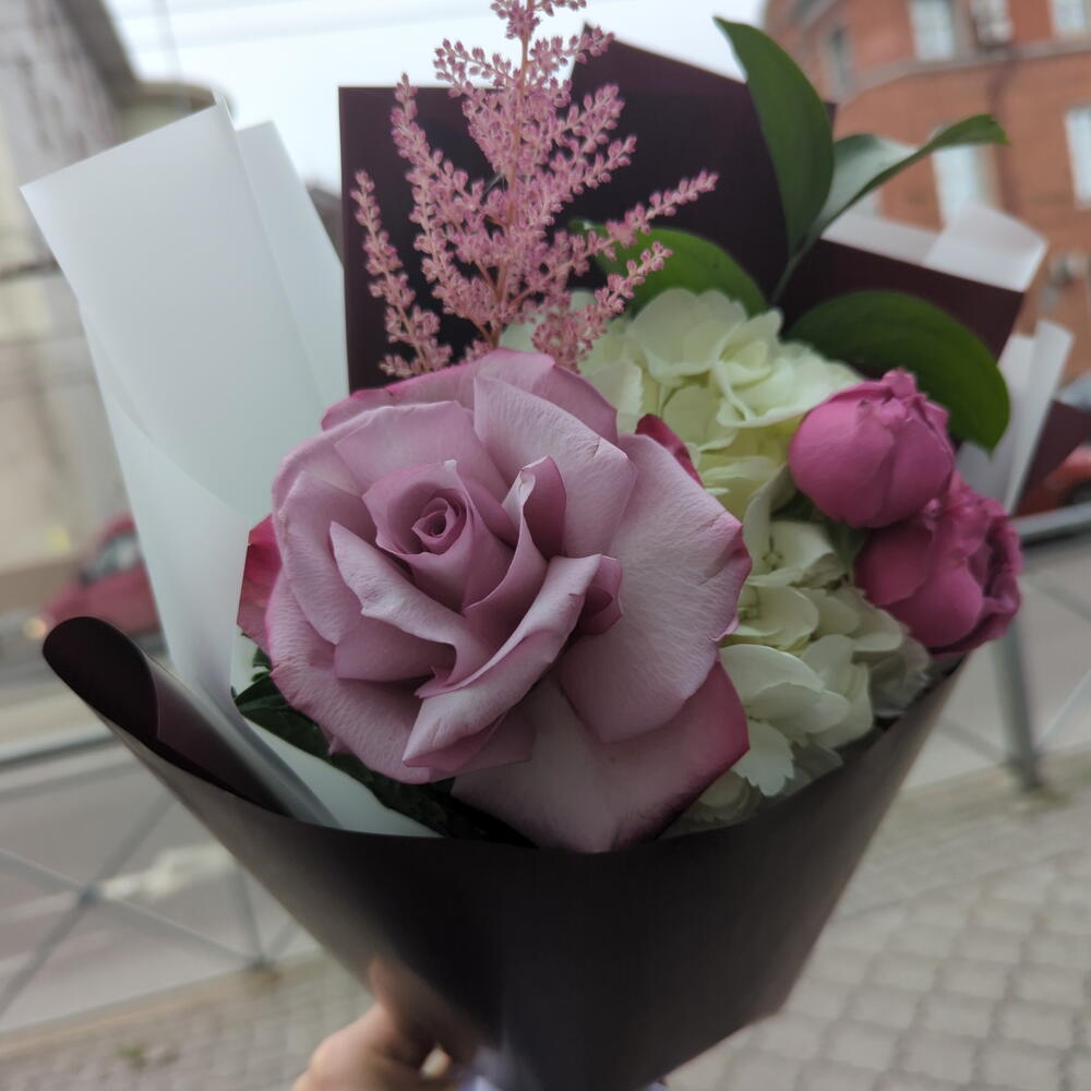 Астильба - 1 шт. Гортензия - 1 шт. Рускус - 1 шт. Упаковка дизайнерская - 1 шт. Французская роза - 1 шт. Пионовидная кустовая роза - 1 шт.