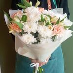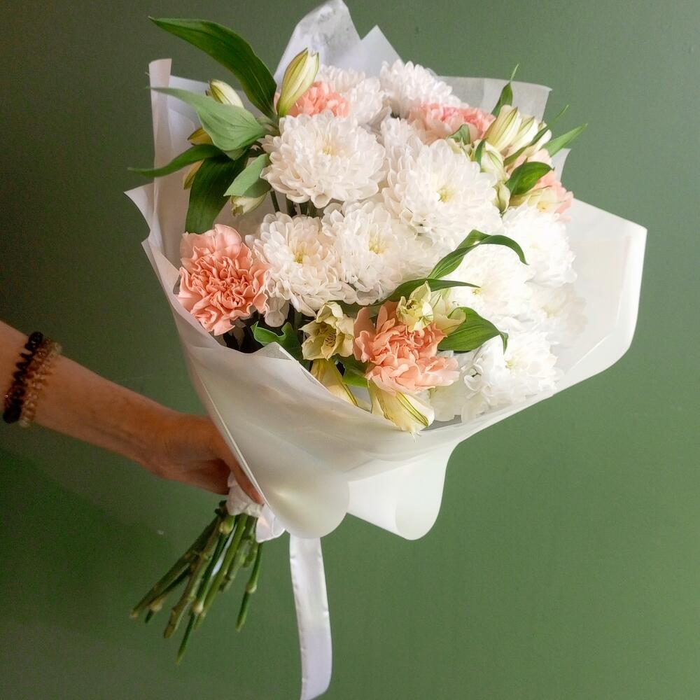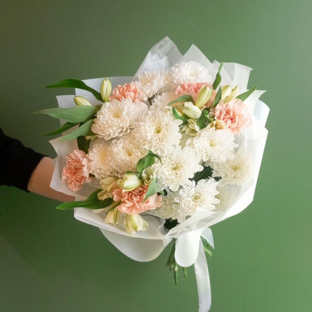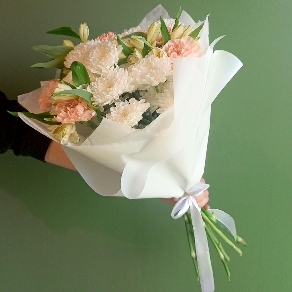 Альстромерия - 3 шт. Хризантема кустовая - 3 шт. Гвоздика - 5 шт. Упаковка дизайнерская - 1 шт. работа нежных рук флориста(бесплатно и с любовью) - 1 шт.