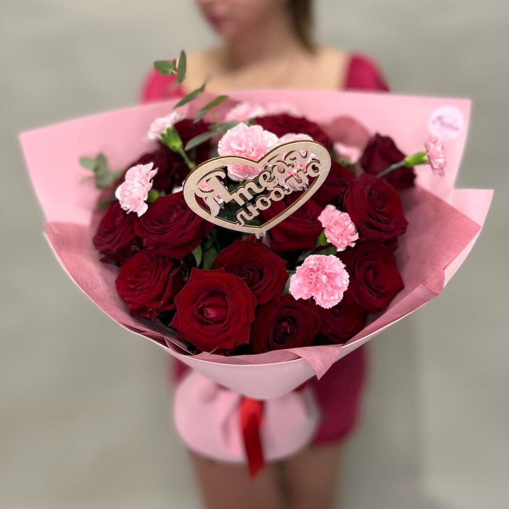 Эвкалипт - 3 шт. Роза - 19 шт. Лента атласная - 1 шт. Гвоздика кустовая - 4 шт. Топпер - 1 шт. Дизайнерская упаковка - 2 шт.