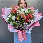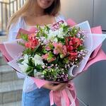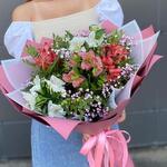 Писташ (питассия) - 5 шт. Дизайнерское оформление - 3 шт. Гипсофила розовая - 3 шт. альстромерия микс европа - 7 шт.