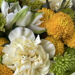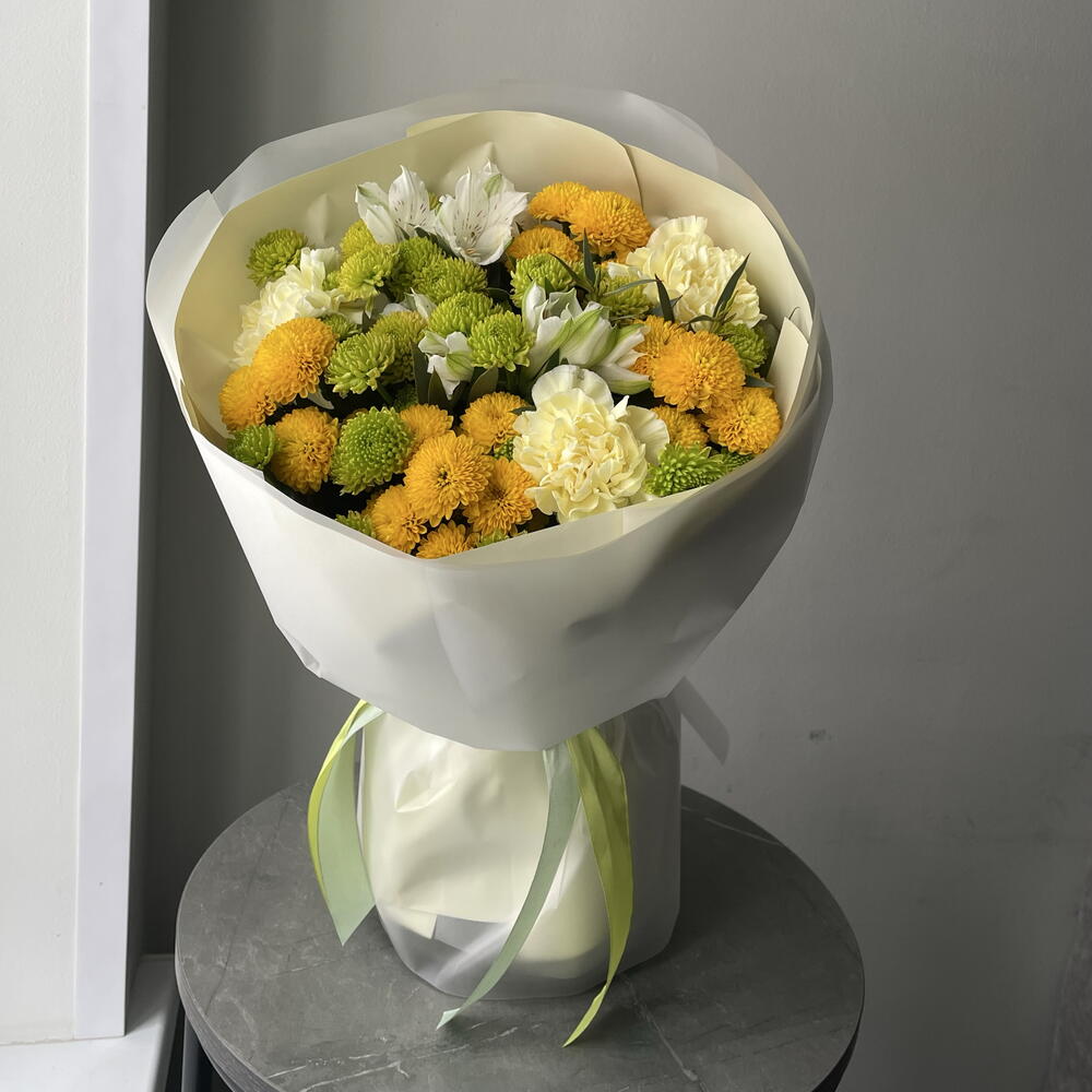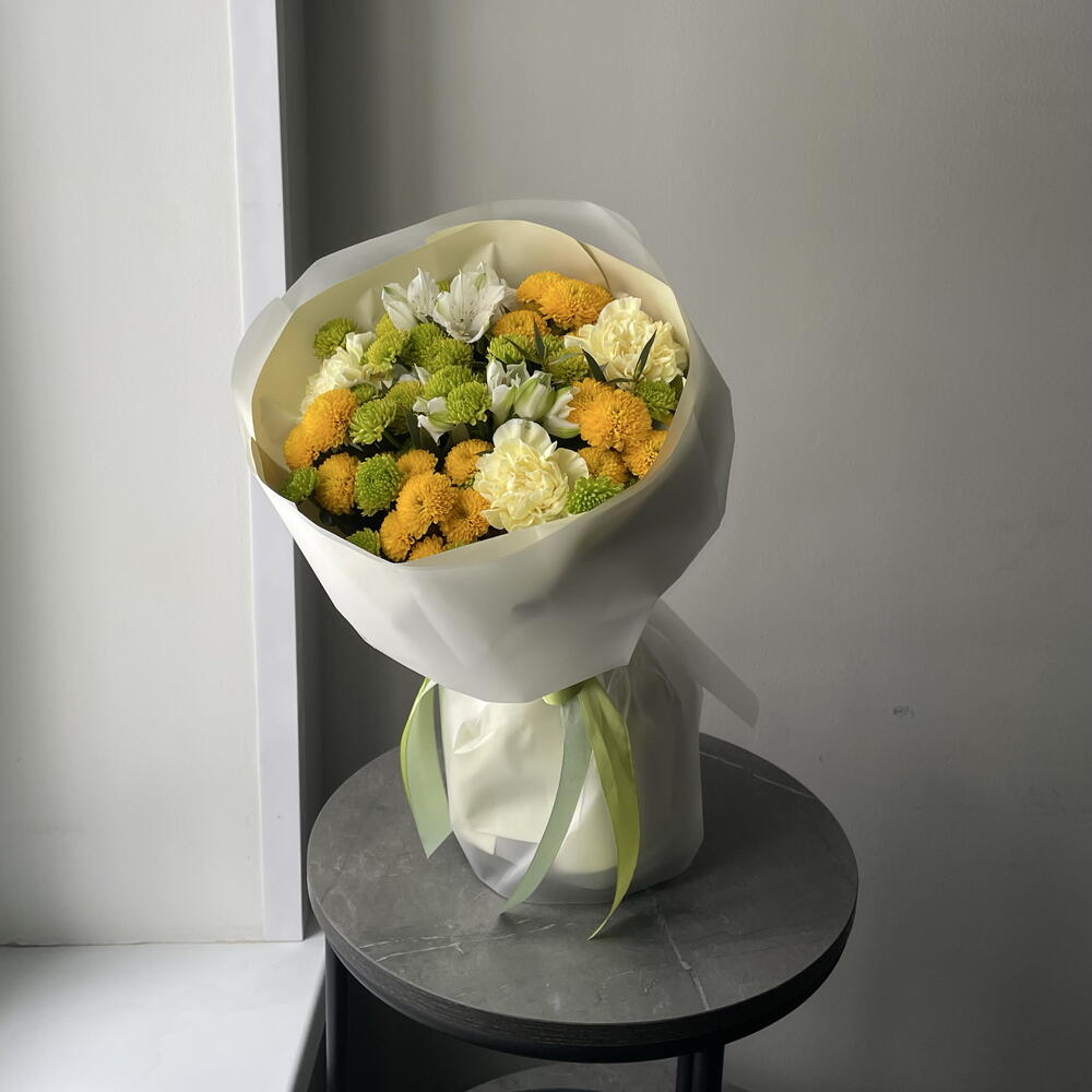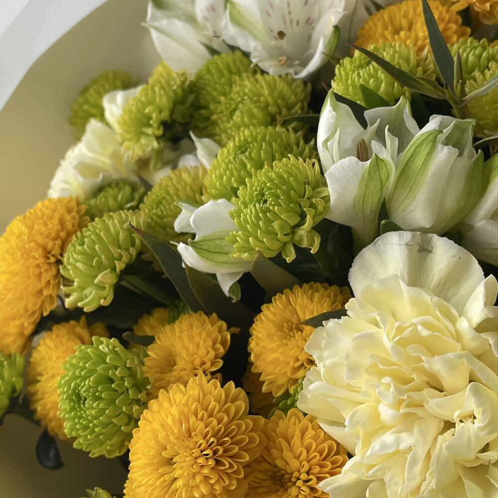 Эвкалипт Парвифолия - 1 шт. Диантус желтый - 3 шт. Хризантема сантини зеленая - 4 шт. Упаковка матовая пленка - 1 шт. упаковка бежевая - 1 шт. хризантема сантини ауринко желтая - 4 шт. альстромерия белая - 2 шт.