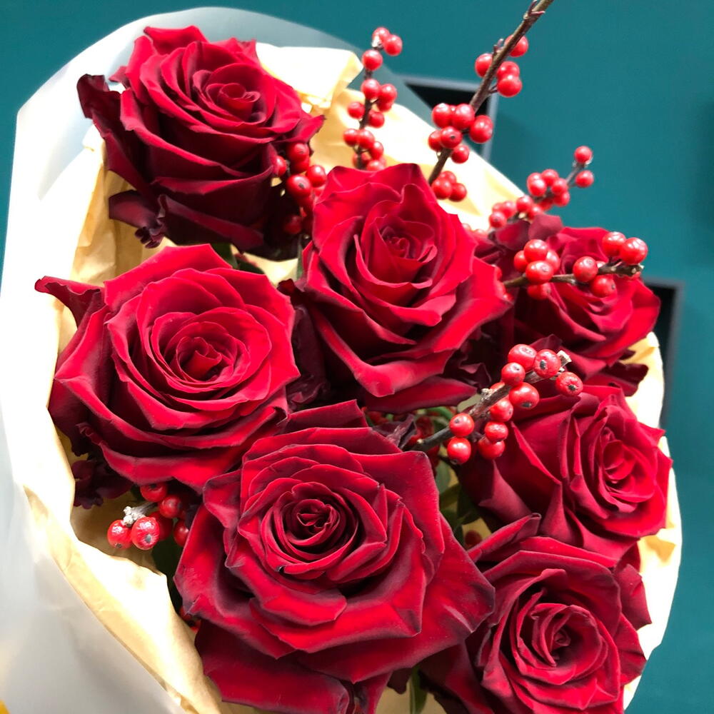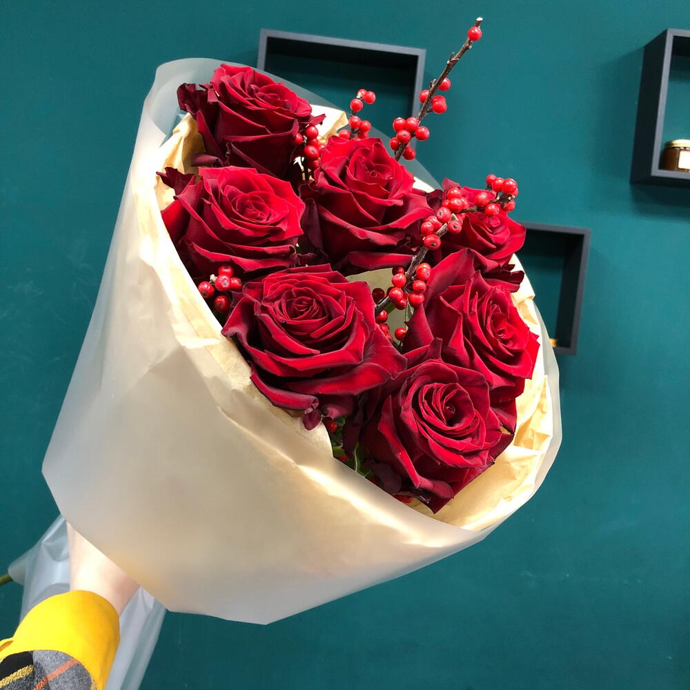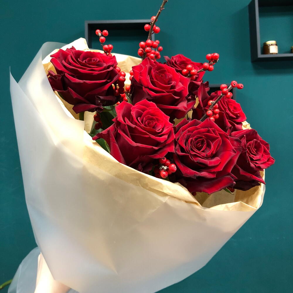 Тишью - 1 шт. Роза Эксплорер - 7 шт. Пленка матовая - 1 шт. Илекс Красный - 2 шт.
