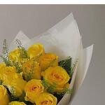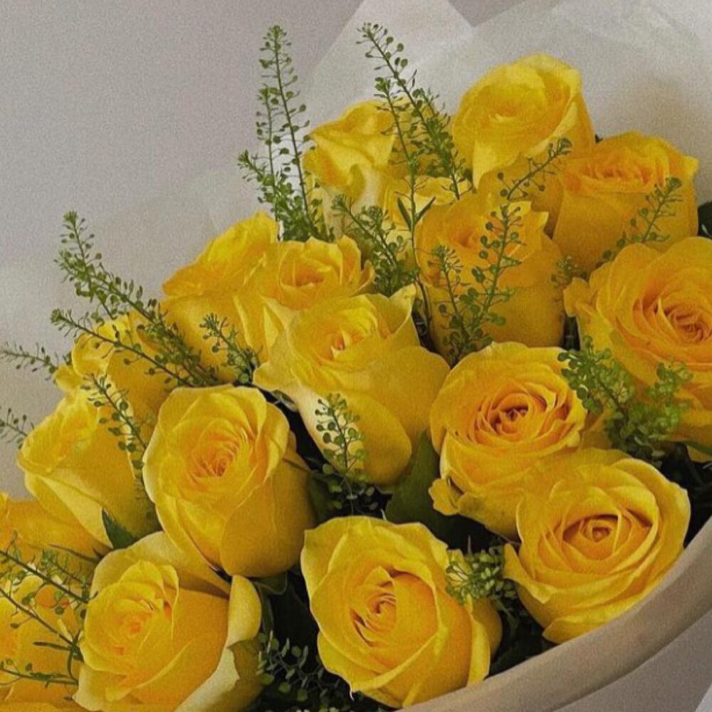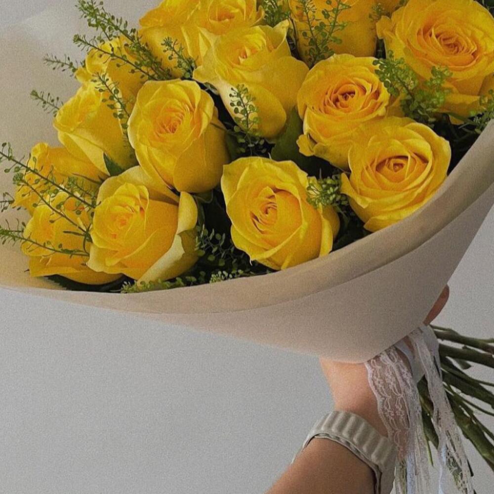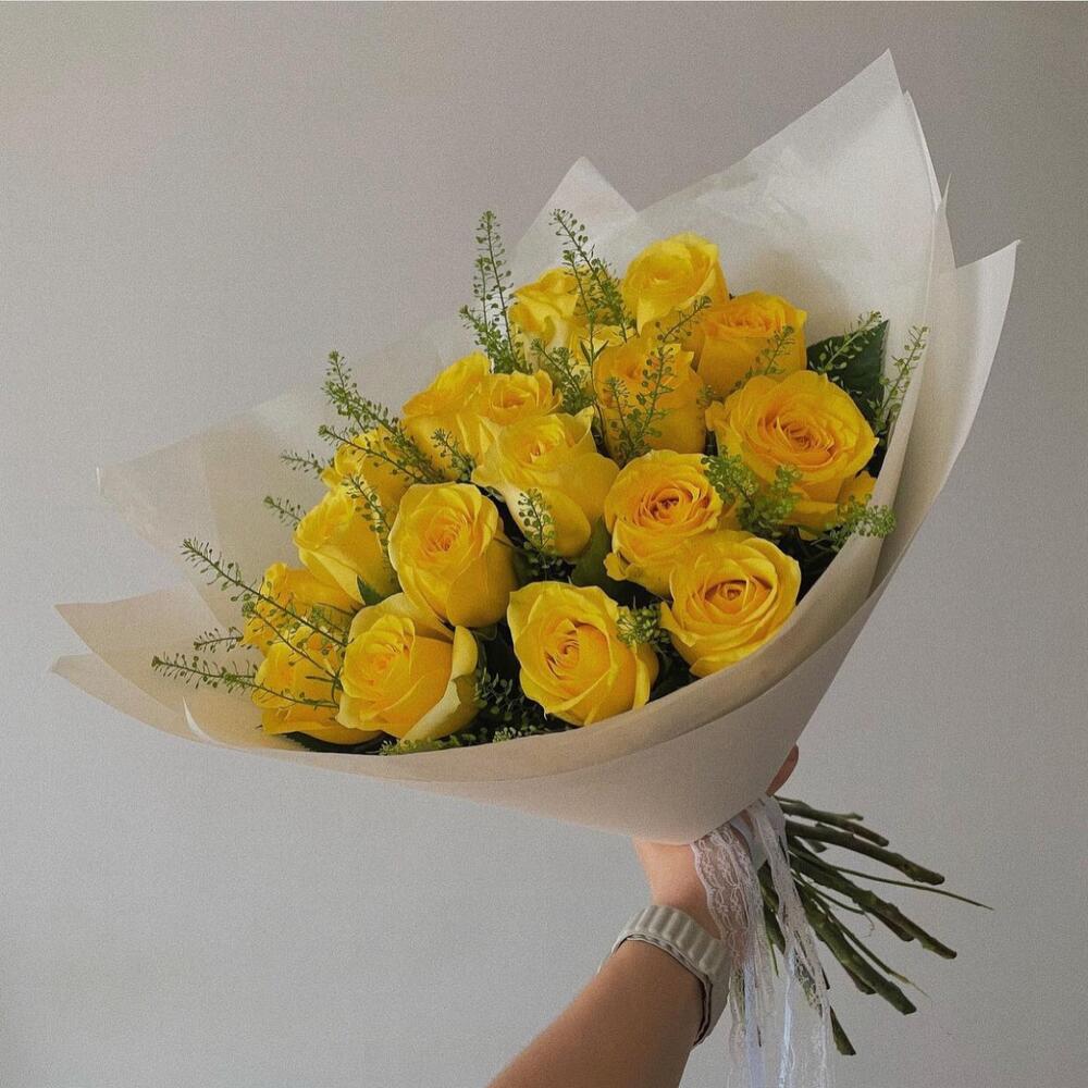 Роза желтая - 17 шт. Открыточка с вашими пожеланиями - 1 шт. зелень декоративная - 5 шт. хорошее настроение - 1000 шт. упаковка дизайнерская с лентой - 1 шт.