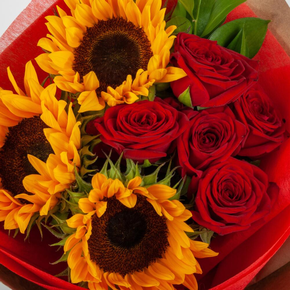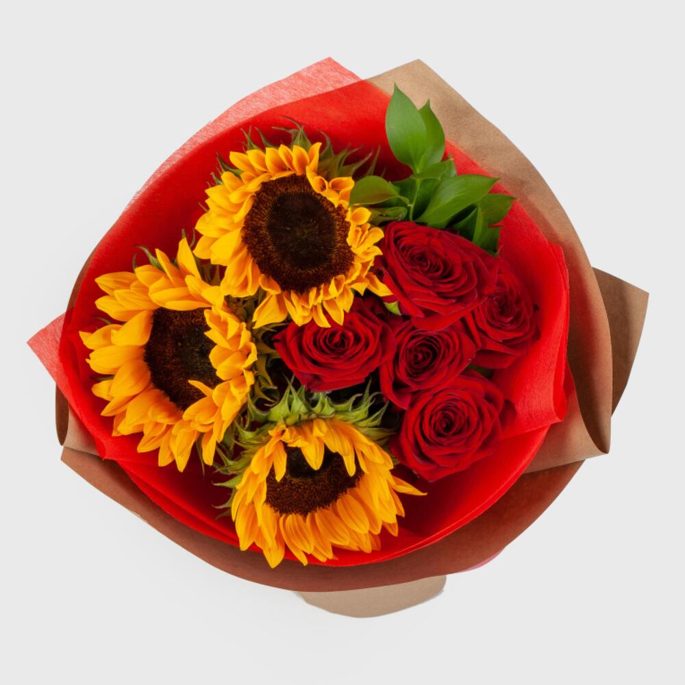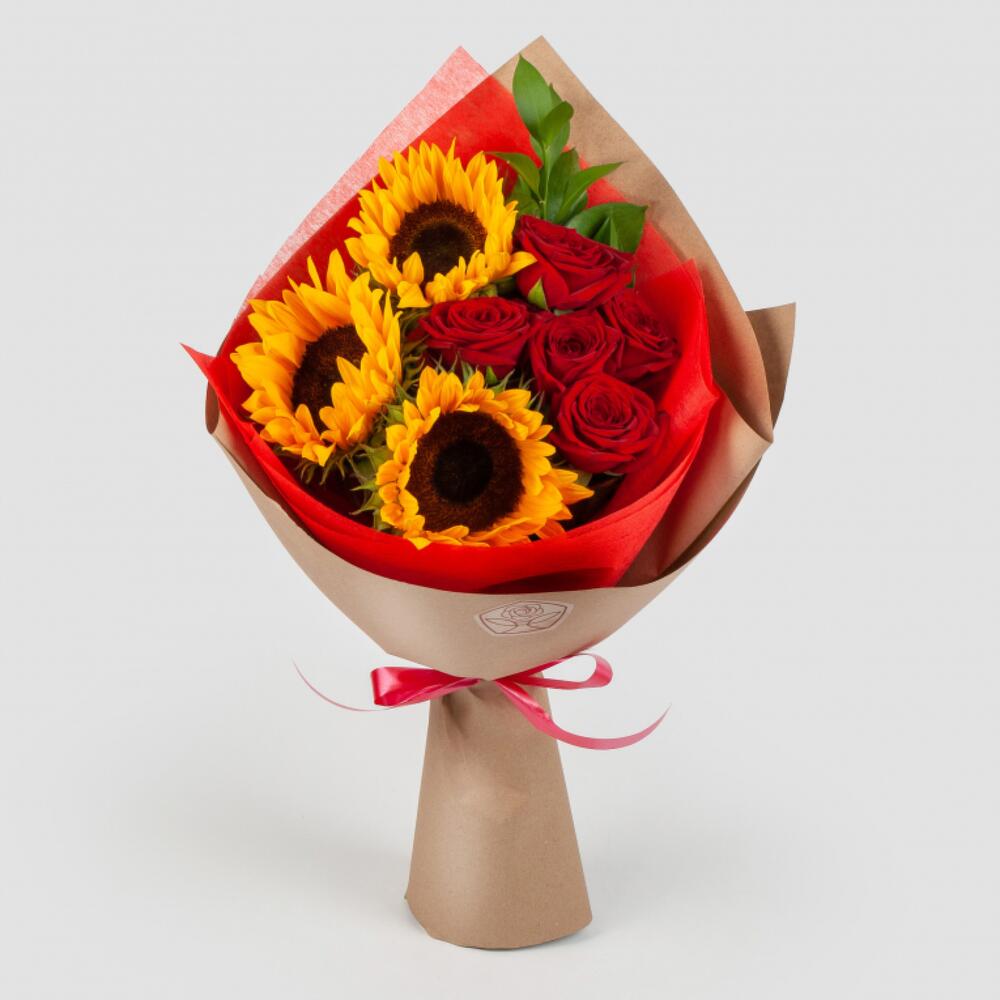 Рускус - 3 шт. роза red naomi (60 см) - 5 шт. подсолнух (гелиантус) - 3 шт.