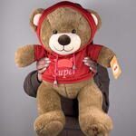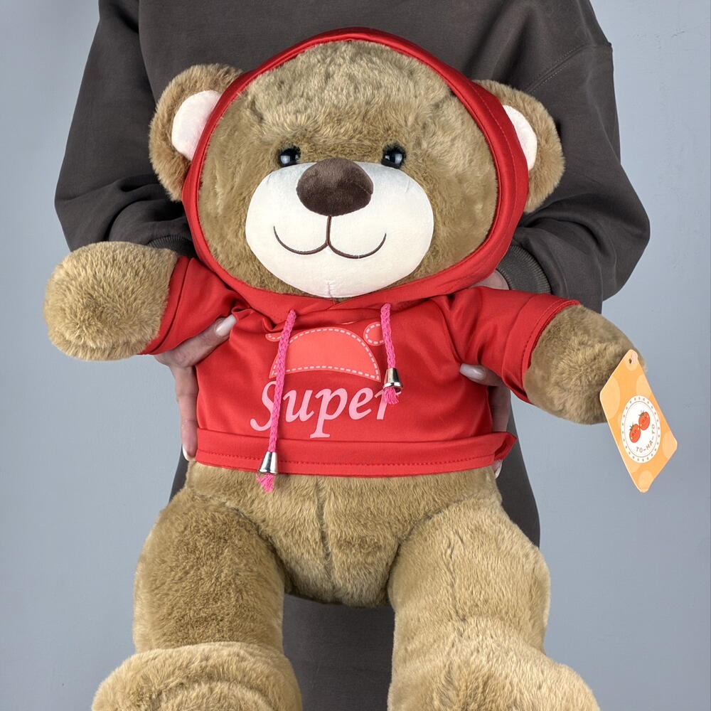 Бурый плюшевый медведь в красном худи