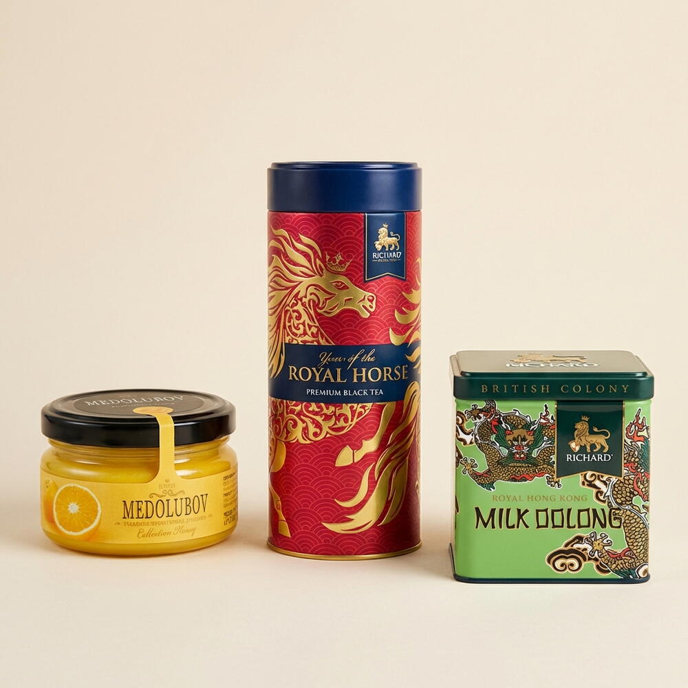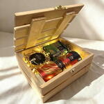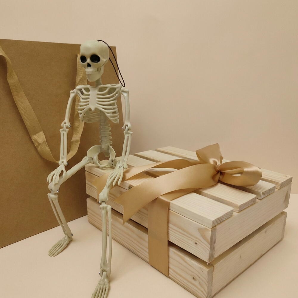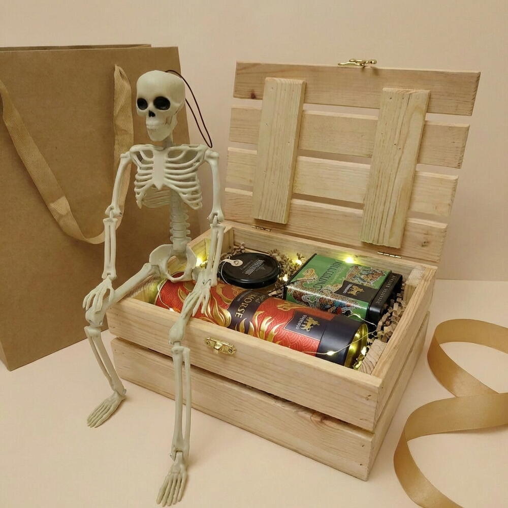 Деревянный ящик ручной работы - 1 шт. зеленый чай молочный улун - 50 гр. премиум черный чай richard - 90 гр. мед медолюбов (рандомный вкус) - 100 мл гнущийся скелет человека - 1 шт.