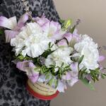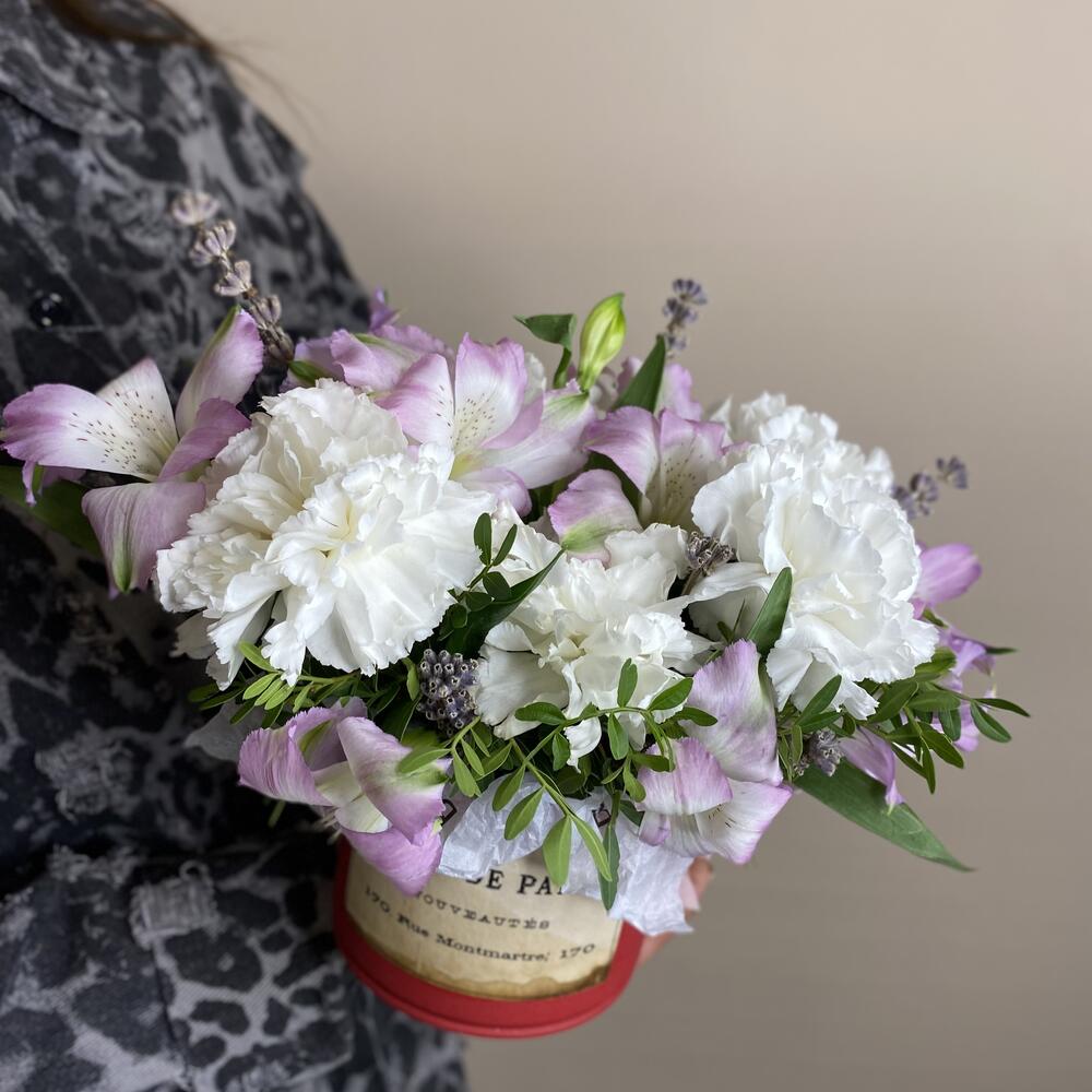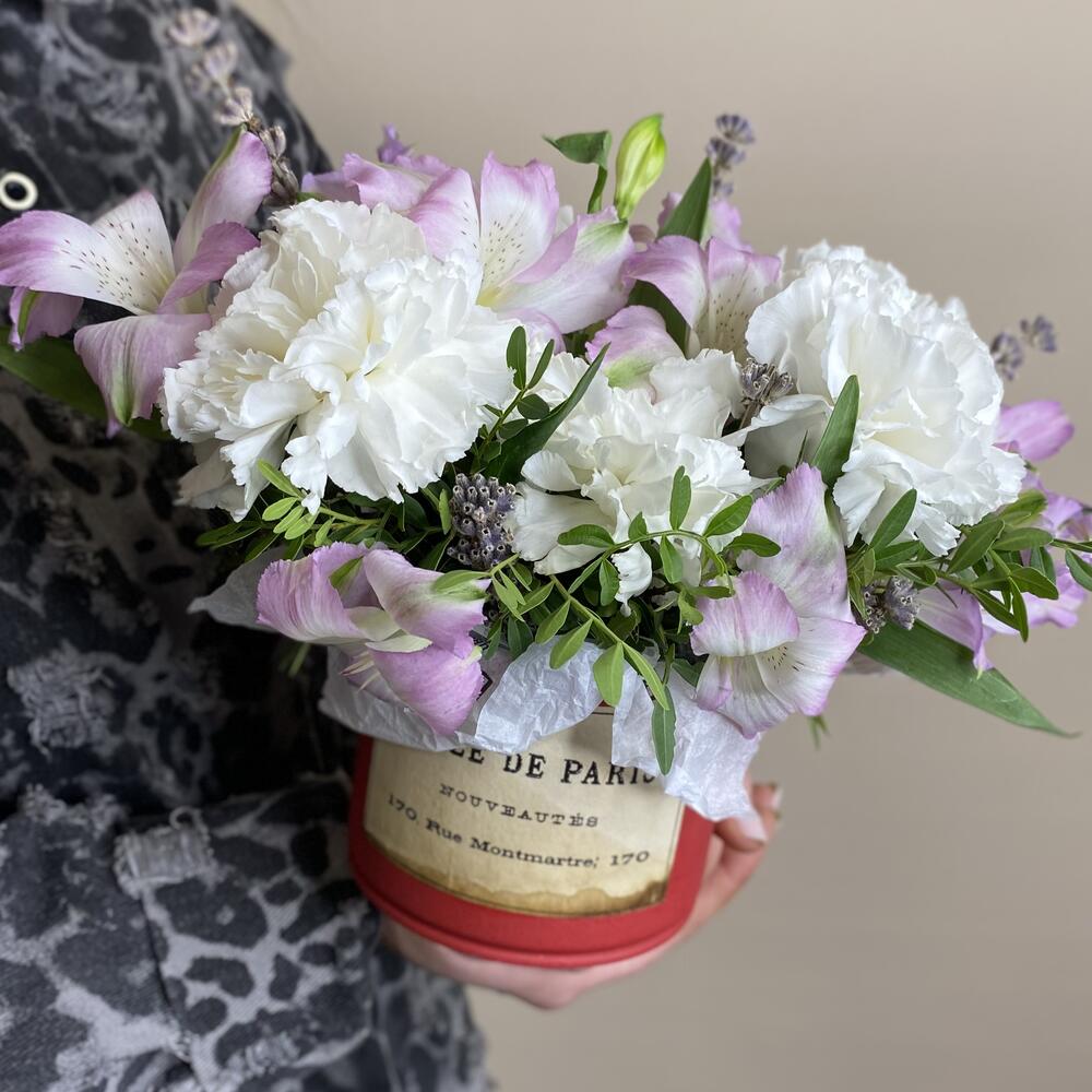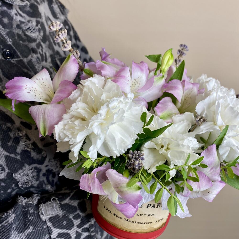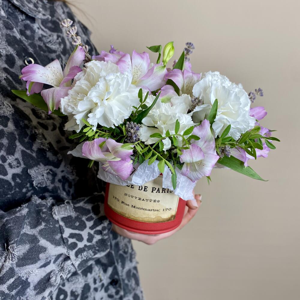 Альстромерия - 2 шт. Писташ - 1 шт. Гвоздика - 7 шт. Тишью - 1 шт. Лаванда сухоцвет - 6 шт. кашпо цинковое - 1 шт.