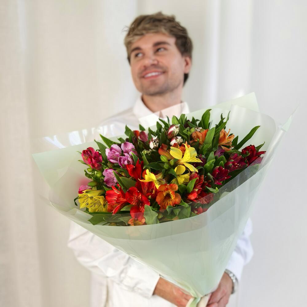 Этот впечатляющий букет из 21 великолепной альстромерии представляет собой настоящее произведение цветочного искусства! Роскошная композиция, наполненная яркими красками красного, фиолетового, жёлтого и зелёного, создаёт атмосферу праздника и торжества. Пышное собрание изящных цветов с их утончёнными лепестками выглядит поистине царственно и станет незабываемым подарком для особенного события. Правила ухода за величественной композицией: Выбор вазы: Подберите просторную вазу большого объёма, которая сможет комфортно разместить все 21 стебель, обеспечивая им достаточно пространства для питания и развития. Подготовка воды: Заполните вазу прохладной отстоянной водой. Добавьте специальную подкормку для срезанных цветов, или приготовьте питательный раствор из сахара (1 чайная ложка на литр воды) с несколькими каплями лимонного сока. Обработка стеблей: Перед установкой в вазу аккуратно подрежьте каждый стебель под углом 45 градусов. Тщательно удалите все листья в нижней части стеблей, которые будут находиться в воде, чтобы предотвратить развитие бактерий. Размещение композиции: Найдите для букета прохладное, хорошо освещённое место без прямых солнечных лучей, защищённое от сквозняков и источников тепла. Оптимальная температура хранения — 18–22°C. Ежедневный уход: Производите полную замену воды в вазе каждый день. Тщательно промывайте стебли под проточной водой. Опрыскивайте цветы из пульверизатора, избегая попадания воды на лепестки. Своевременно удаляйте увядшие цветы и листья. Регулярно проверяйте и поддерживайте необходимый уровень воды. Важные рекомендации: Держите букет вдали от спелых фруктов. Избегайте размещения рядом с работающими кондиционерами и отопительными приборами. Защищайте от табачного дыма. При первых признаках увядания обновляйте срезы стеблей. Срок свежести при соблюдении всех правил ухода — до 7–10 дней.