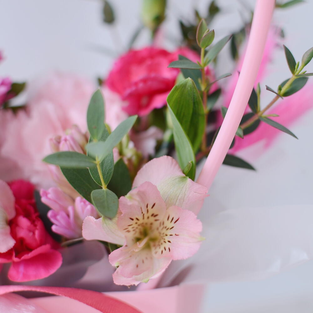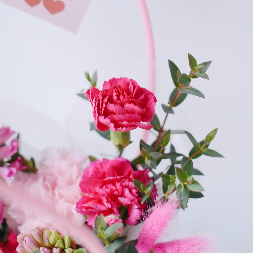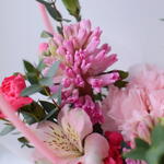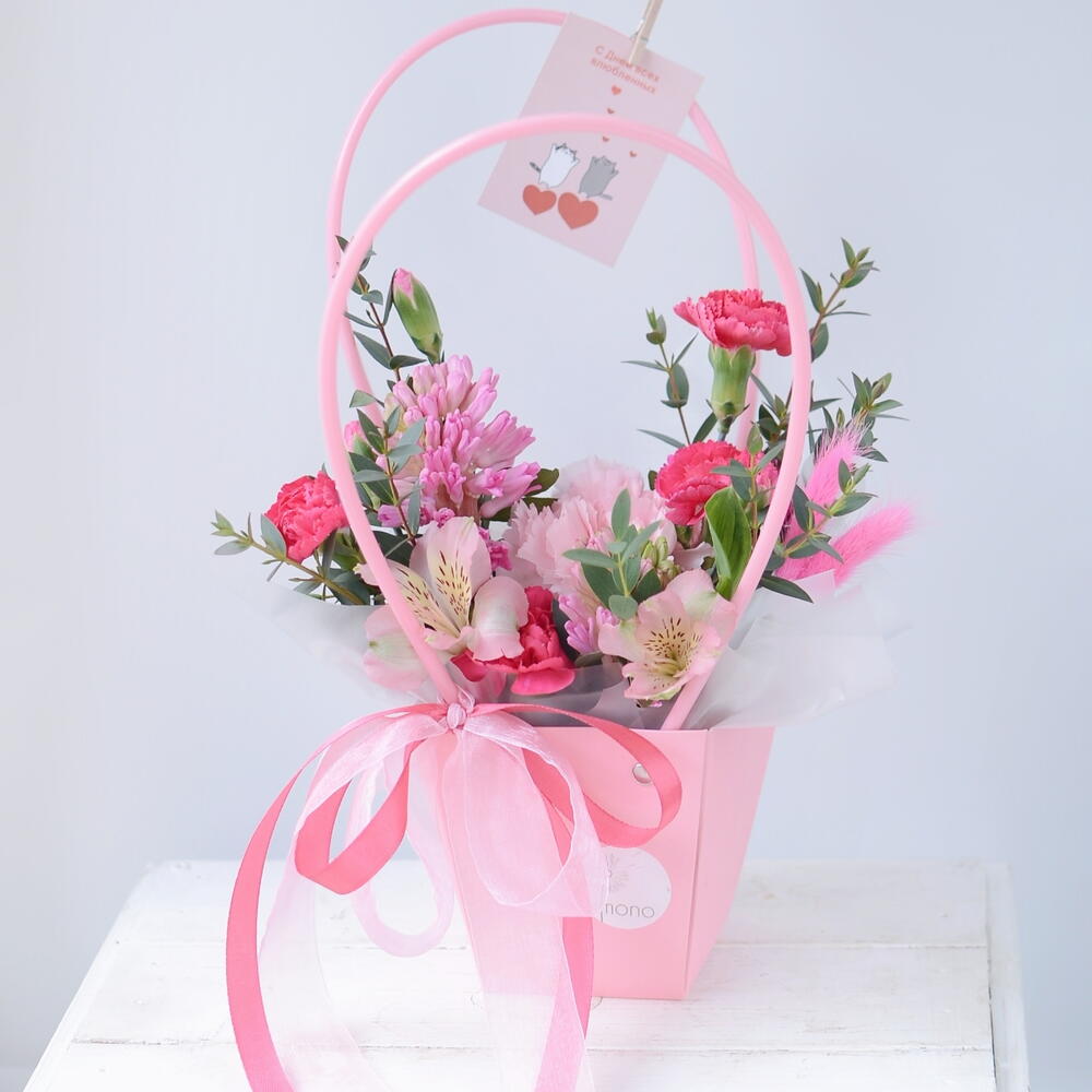 Гиацинт - 2 шт. Лента - 2 шт. Сумочка - 1 шт. Диантус кустовой - 2 шт. Эвкалипт пучок - 1 шт. Оазис флористический - 1 шт. Диантус сортовой - 1 шт. валентинка - 1 шт.