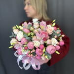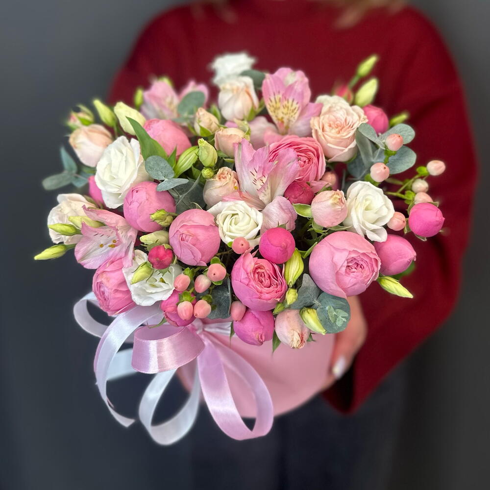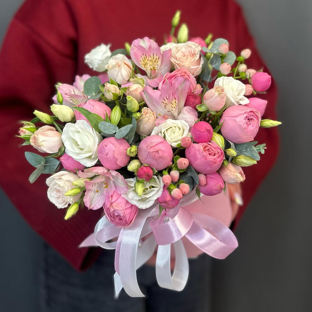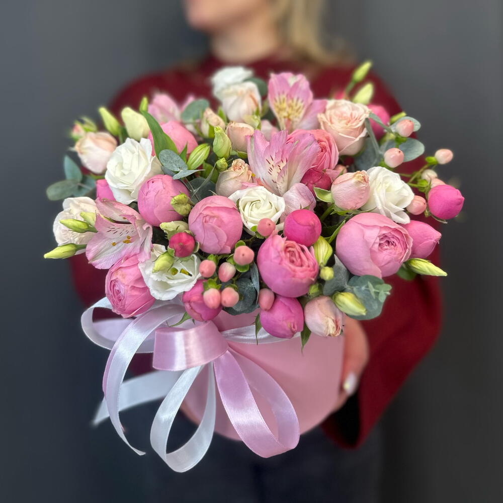 Цветочная композиция в розовой коробке с пионовидными розами/альстромериями