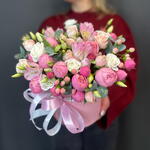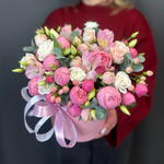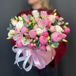 Альстромерия - 1 шт. Гиперикум - 2 шт. Лизиантус - 1 шт. Коробка шляпная - 1 шт. Эвкалипт Микс - 1 шт. Оазис флористический - 1 шт. Бомбастик роза - 2 шт. сильва пинк кустовая роза - 3 шт.