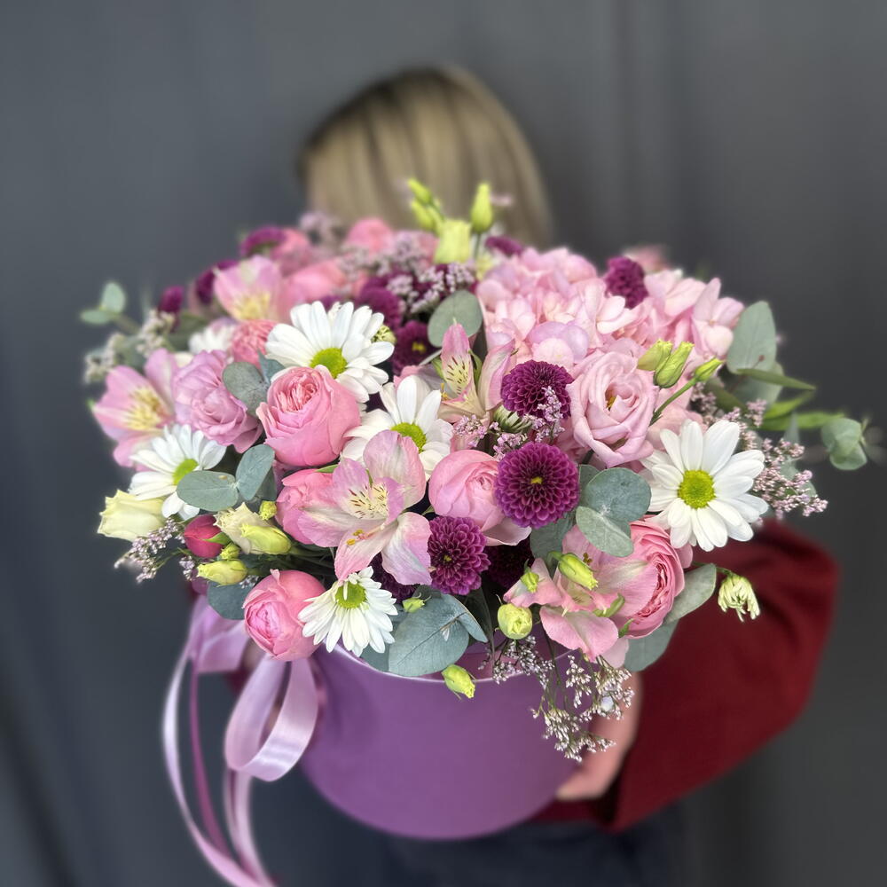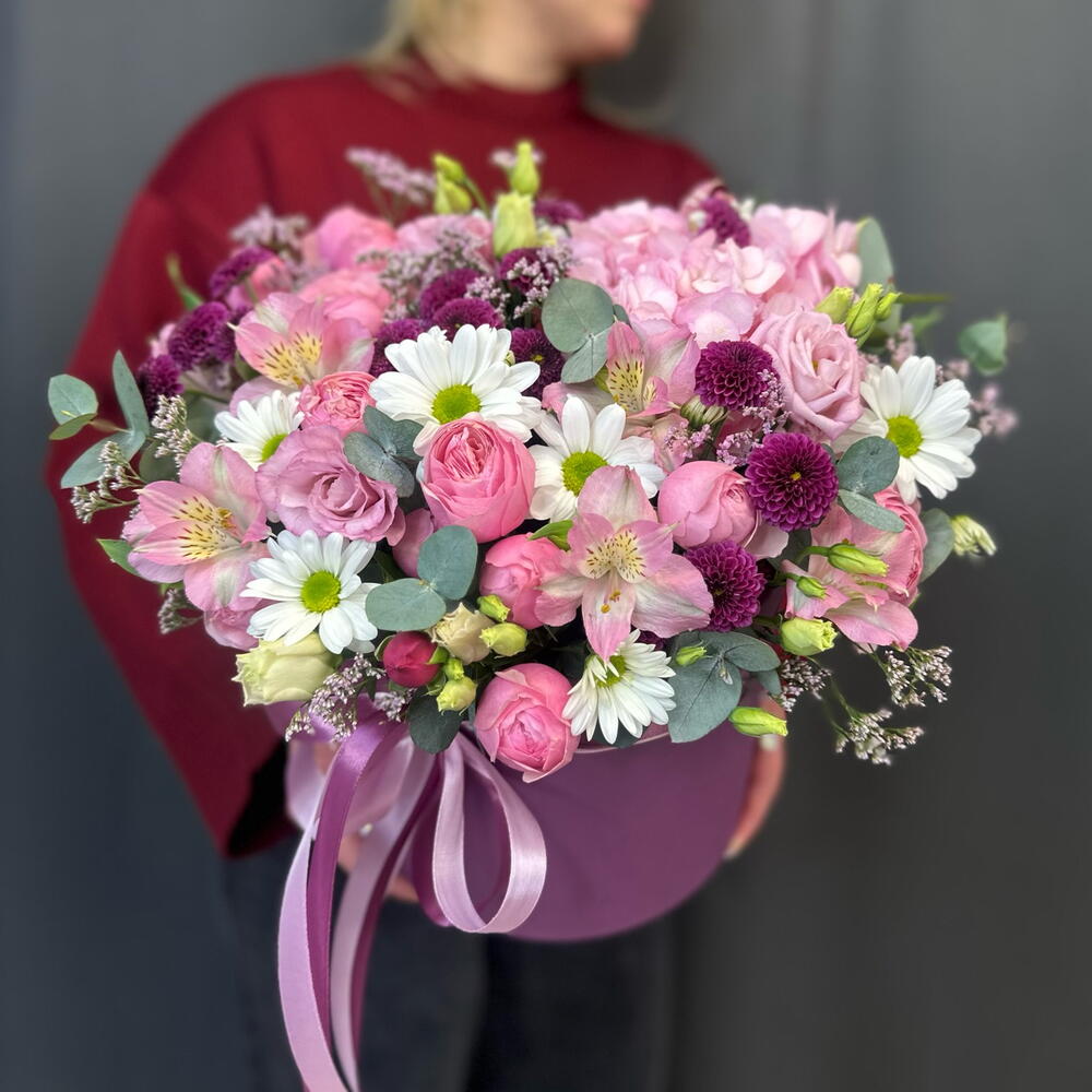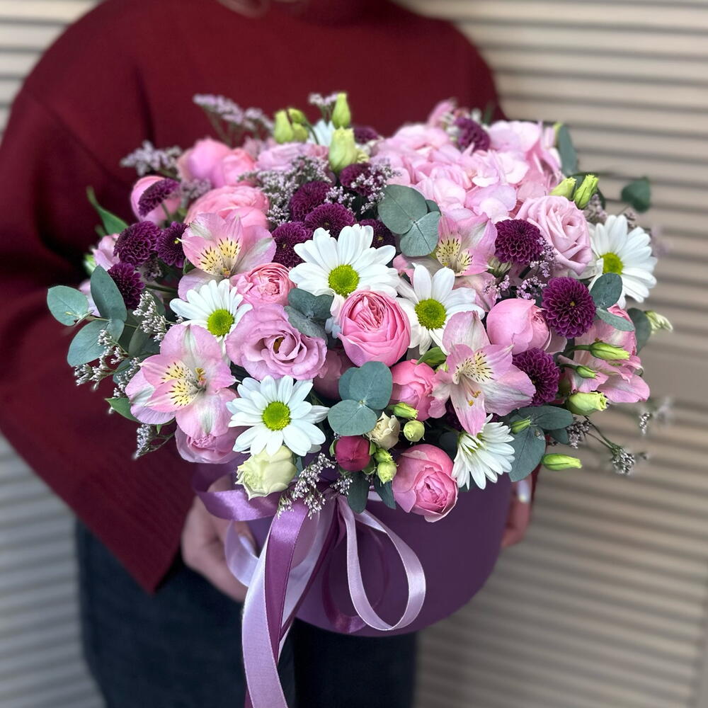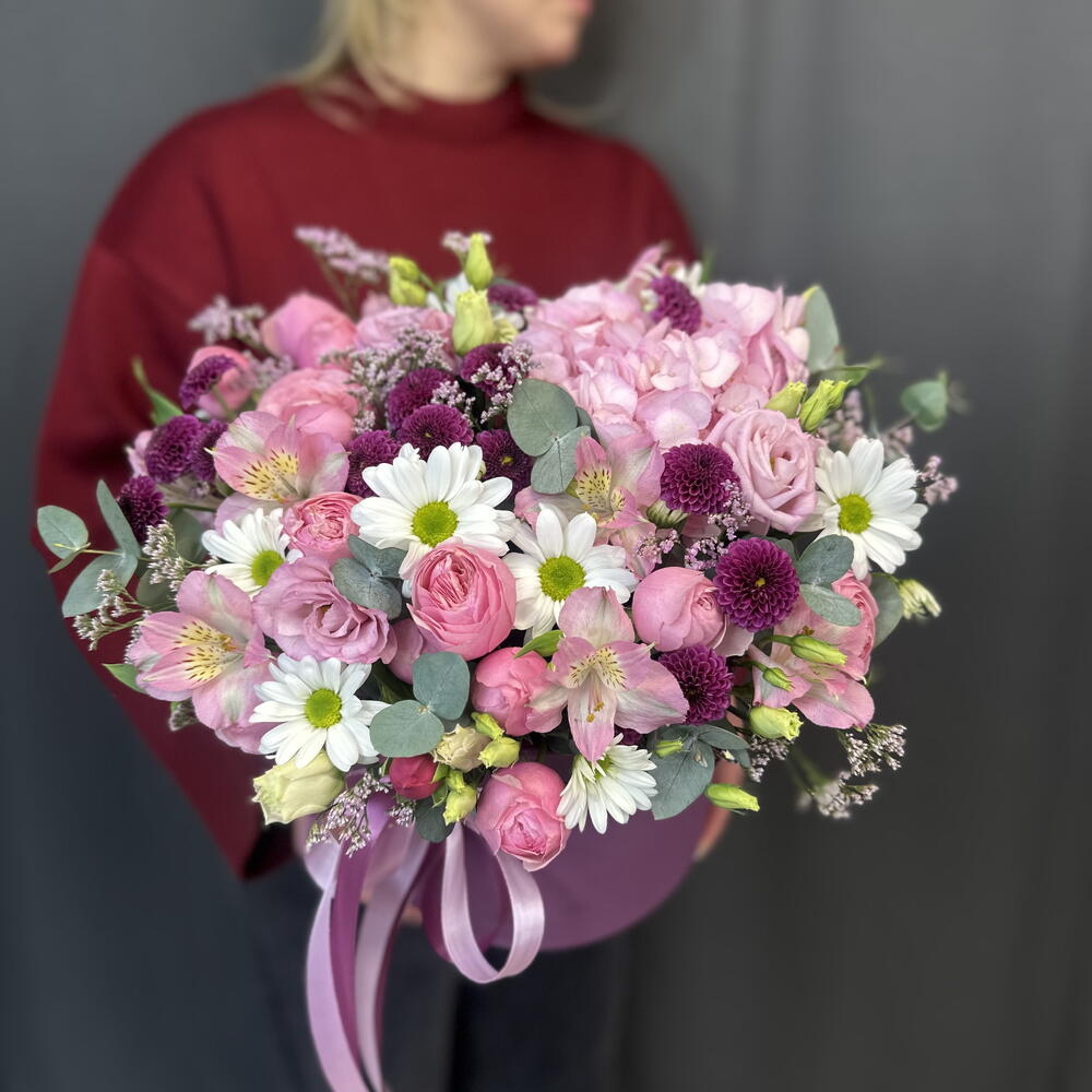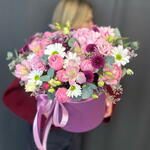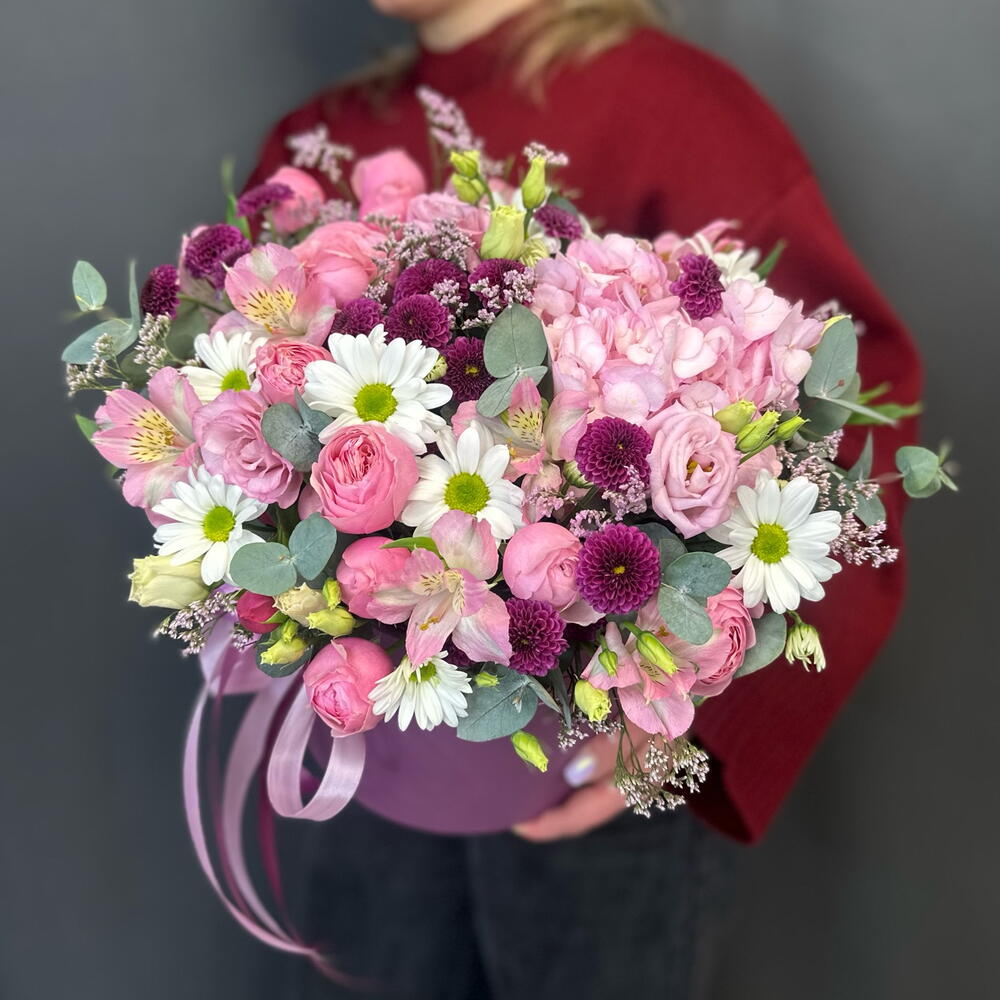 Альстромерия - 2 шт. Гортензия - 1 шт. Лизиантус - 1 шт. Лимониум - 1 шт. Хризантема кустовая - 1 шт. Коробка шляпная - 1 шт. Сантини - 3 шт. Эвкалипт Микс - 1 шт. Оазис флористический - 3 шт. сильва пинк кустовая роза - 3 шт.