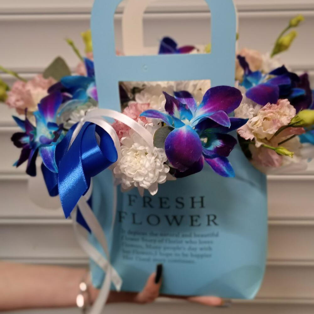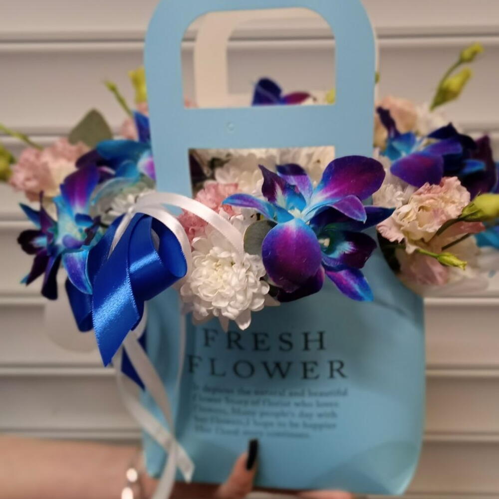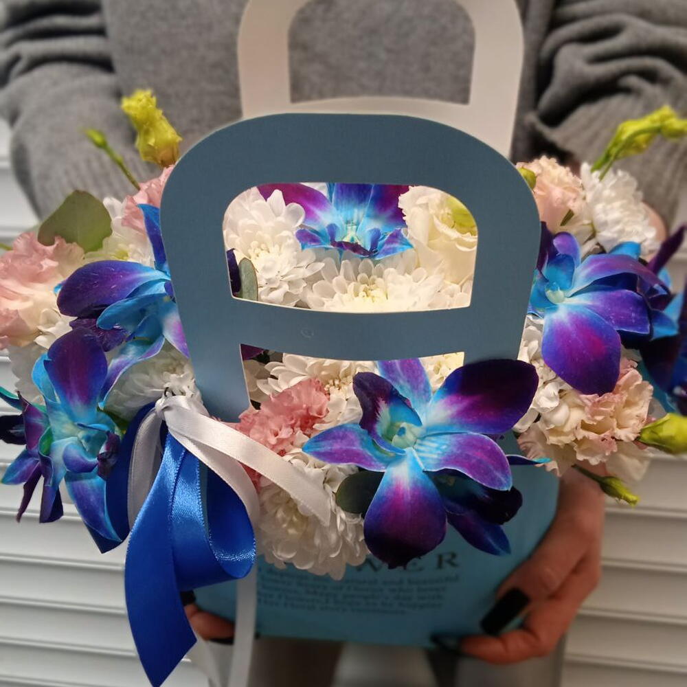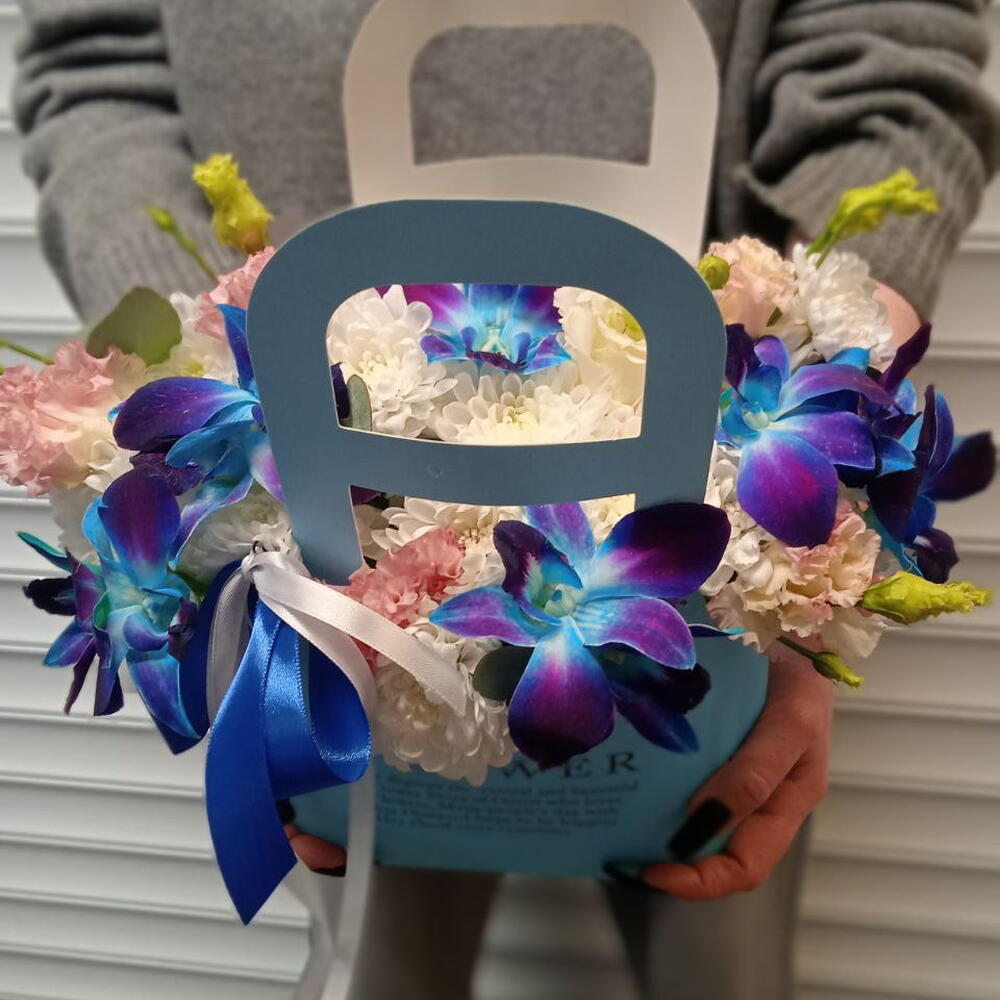 Цветочная композиция в сумочке бело-голубых оттенков