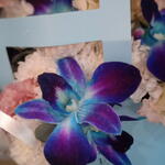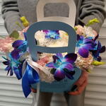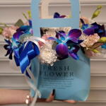 Орхидея Дендробиум - 6 шт. Хризантема кустовая - 3 шт. Эустома - 2 шт. Лента атласная - 1 шт. Сумочка - 1 шт. Оазис флористический - 1 шт.