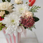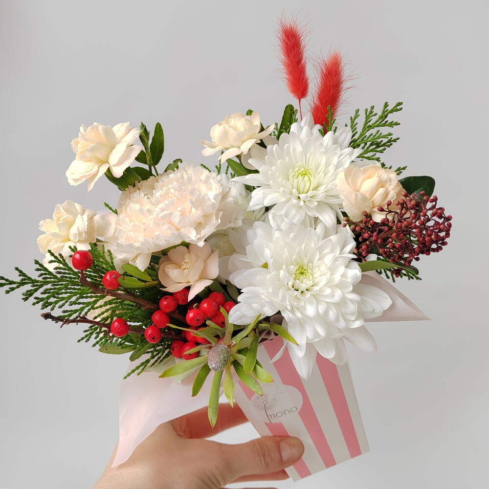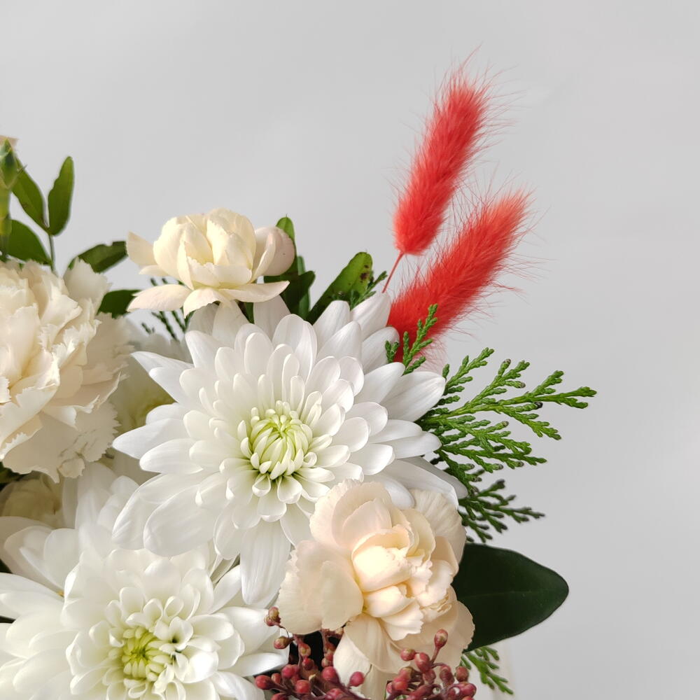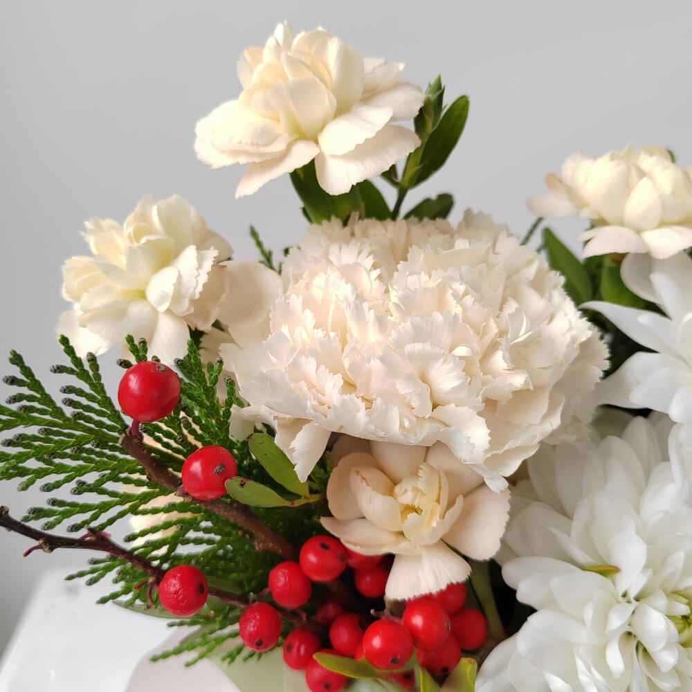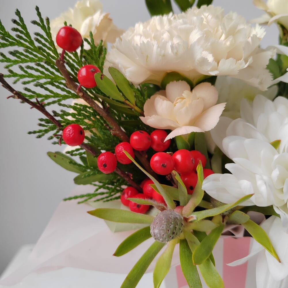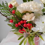 Фисташка - 1 шт. Коробка - 1 шт. Скиммия - 1 шт. Диантус кустовой - 1 шт. Туя - 1 шт. Лагурус - 2 шт. Оазис флористический - 1 шт. Диантус сортовой - 1 шт. хризантема бутон - 3 шт.