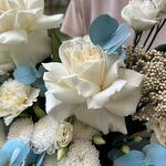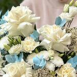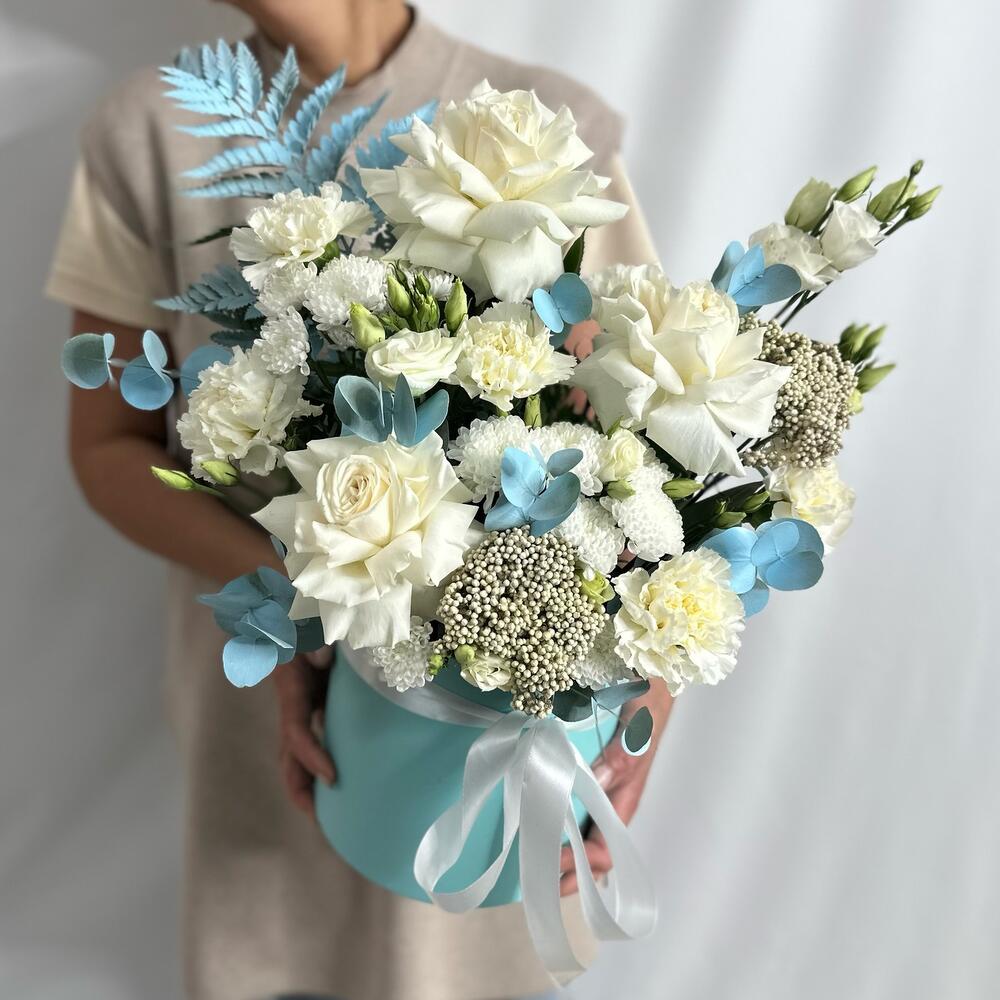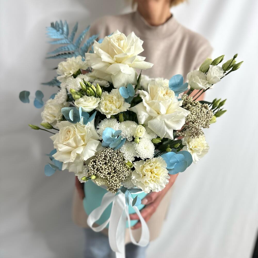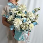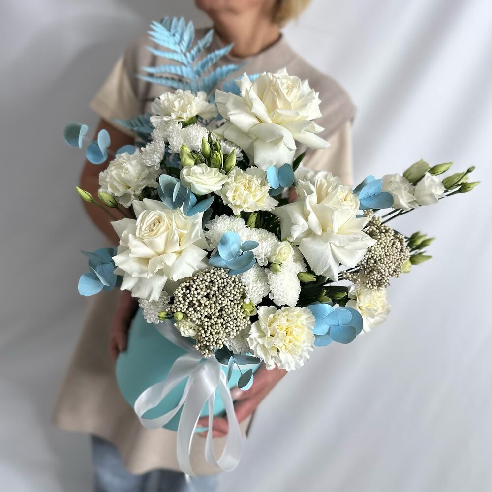 Лизиантус - 2 шт. Озотамнус - 2 шт. Папоротник - 1 шт. Эвкалипт - 2 шт. Роза Эквадор - 3 шт. Диантус - 6 шт. Коробка шляпная - 1 шт. Сантини - 3 шт. Оазис флористический - 2 шт.