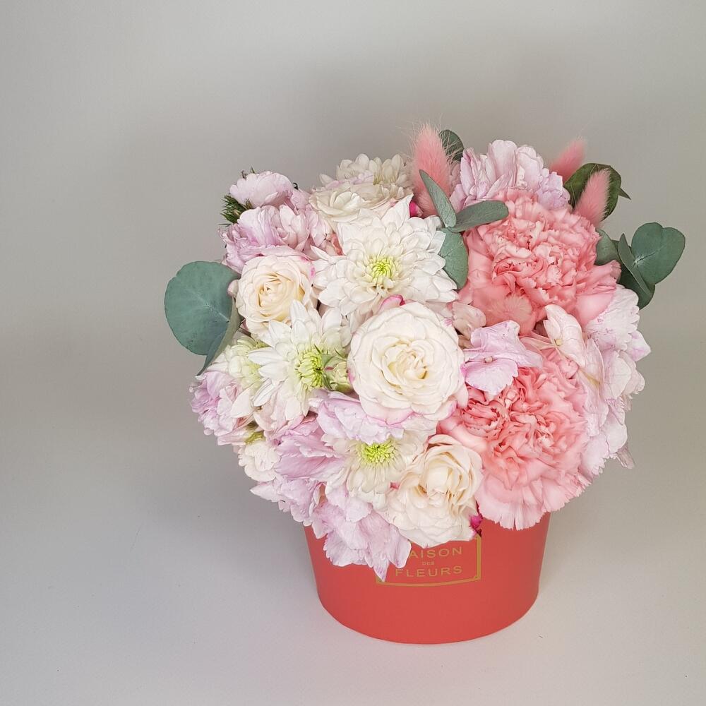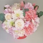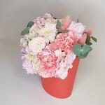 Цветы в коралловой кoрoбке с диантусом и гортензией MAXI