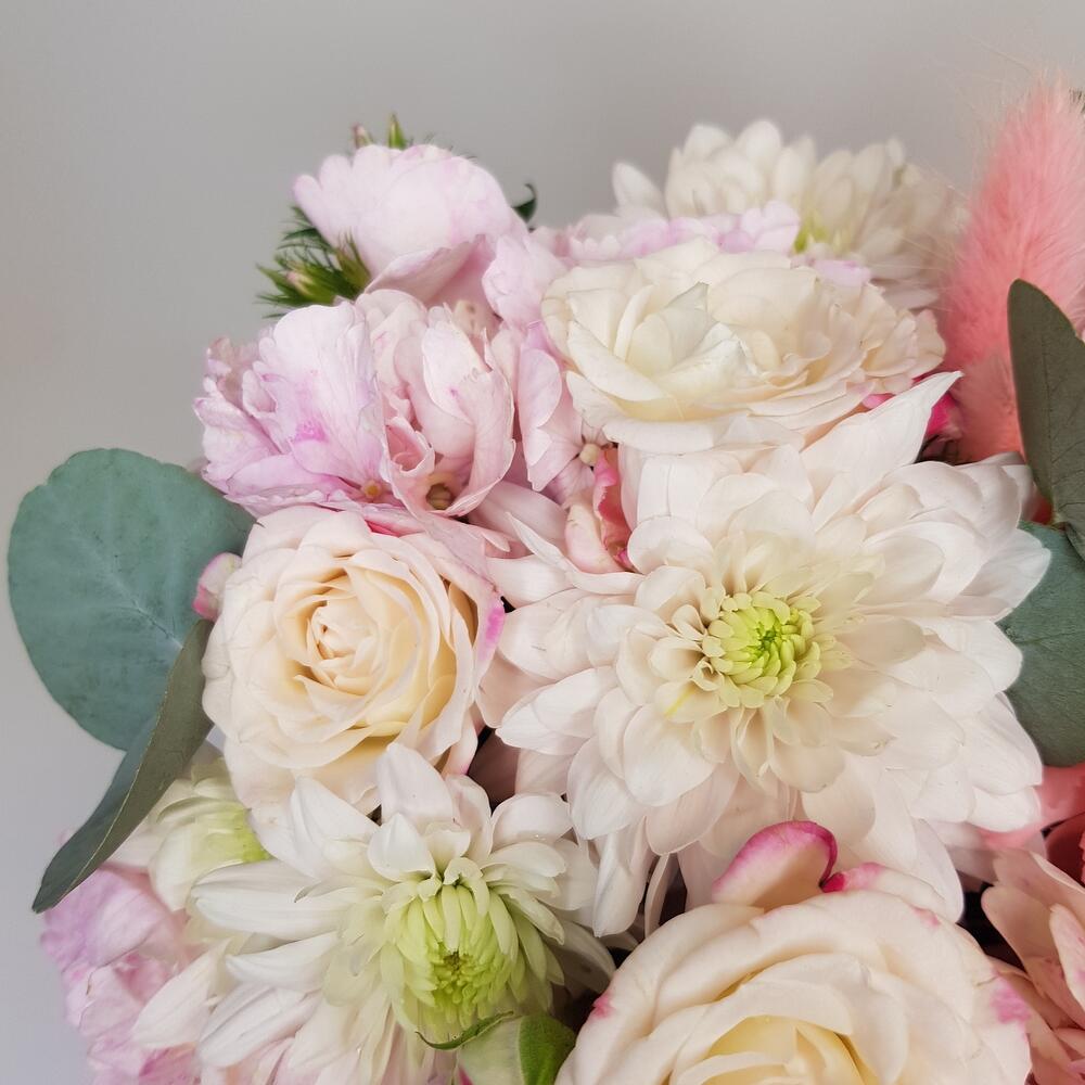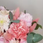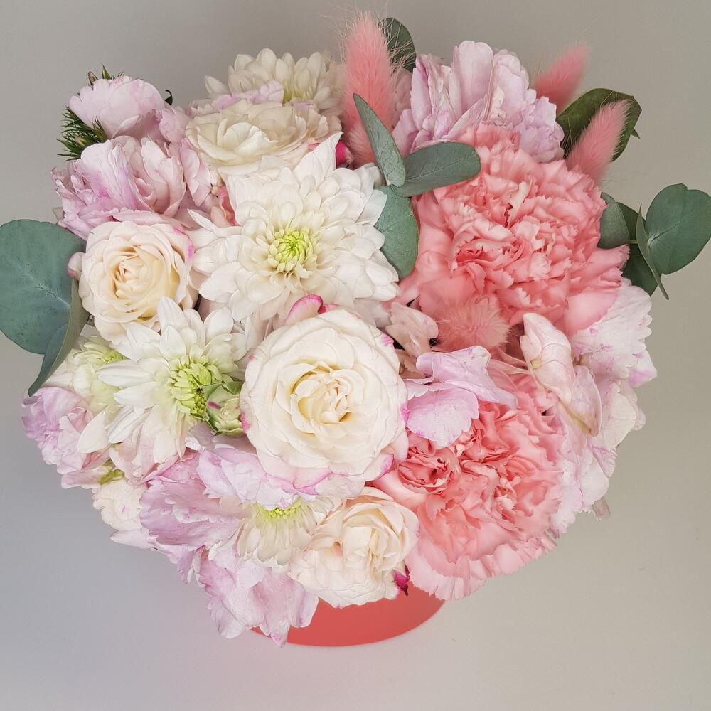 Хризантема кустовая - 1 шт. Эвкалипт - 2 шт. Роза кустовая розовая - 1 унц. Коробка - 1 шт. Гортензия розовая - 1 шт. Диантус розовый - 2 шт. Лагурус (сухоцвет) - 4 шт.
