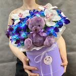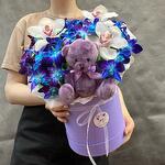 Лента - 1 шт. Орхидея Цимбидиум - 3 шт. Мишка плюшевый - 1 шт. орхидея дендробиум ветки - 5 шт. коробка большая лиловая - 1 шт.