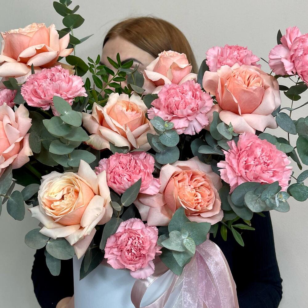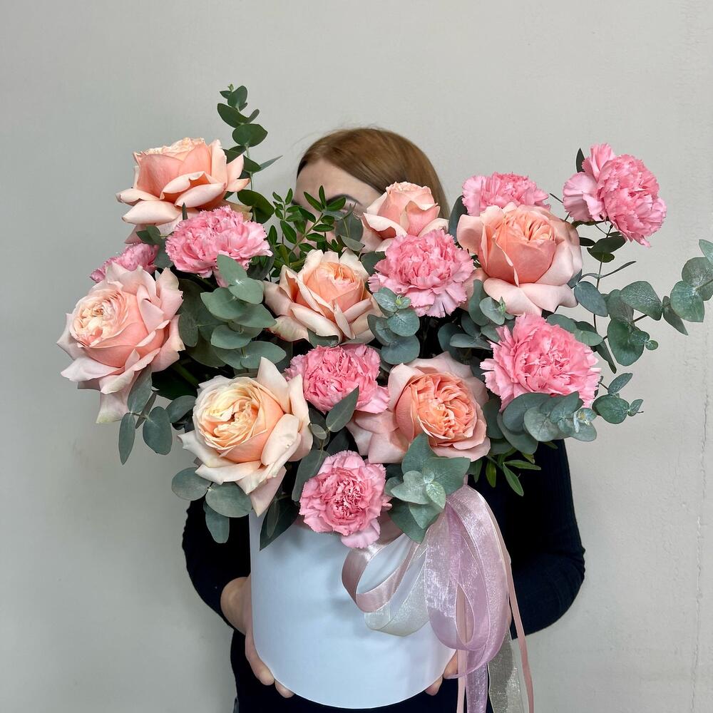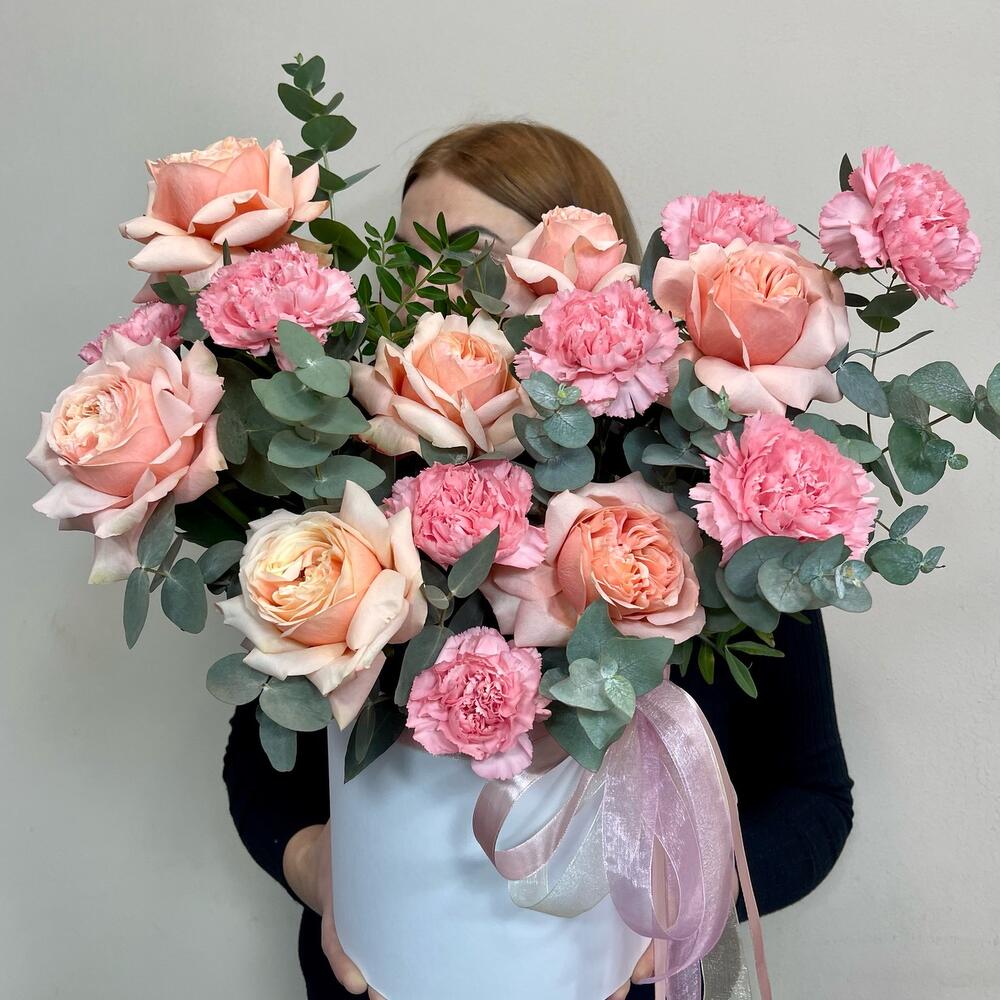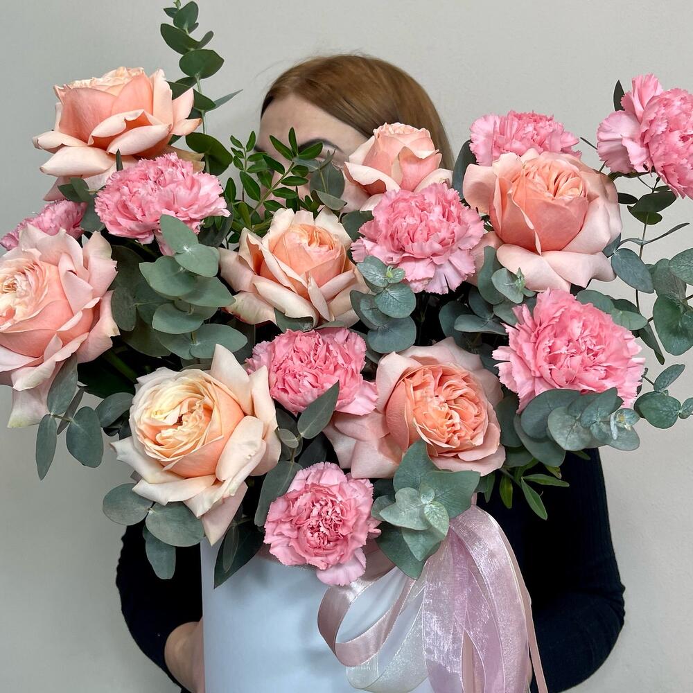 Коробка шляпная белая - 1 шт. Диантус розовый - 9 шт. Эвкалипт Baby Blue - 11 шт. бант атласный двойной - 1 шт. роза вывернутая - 10 шт. зелень декоративная фисташки - 5 шт.