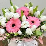Тюльпан - 10 шт. Зелень - 15 шт. Эустома - 5 шт. Гербера - 3 шт. Коробка шляпная - 1 шт. Оазис флористический - 2 шт.