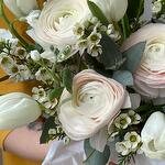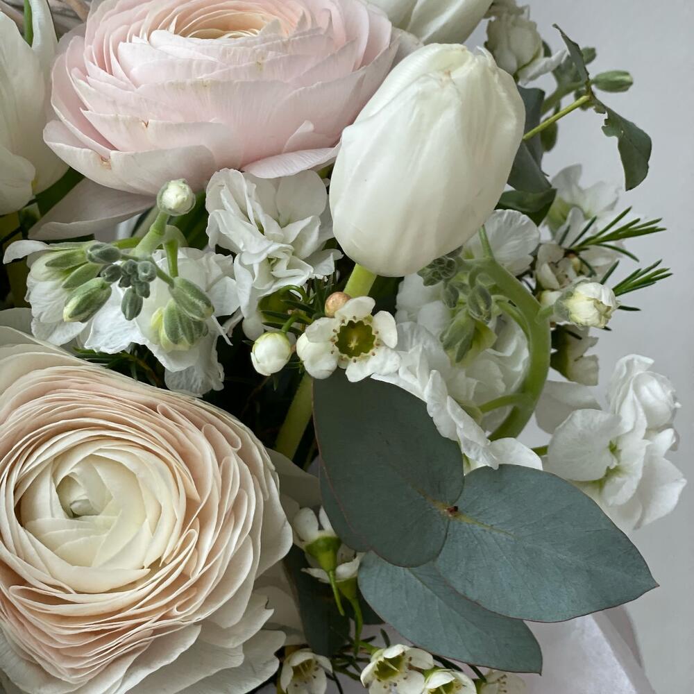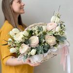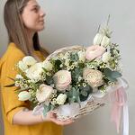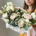 Маттиола - 1 шт. Тюльпан - 15 шт. Эвкалипт - 10 шт. Лента атласная - 2 шт. Хамелациум - 3 шт. Ранункулюс - 5 шт. Корзина плетеная - 1 шт.
