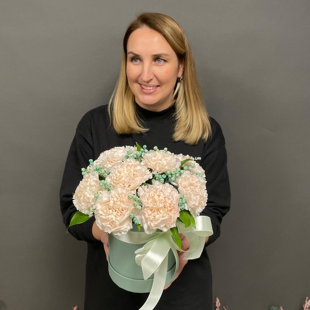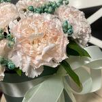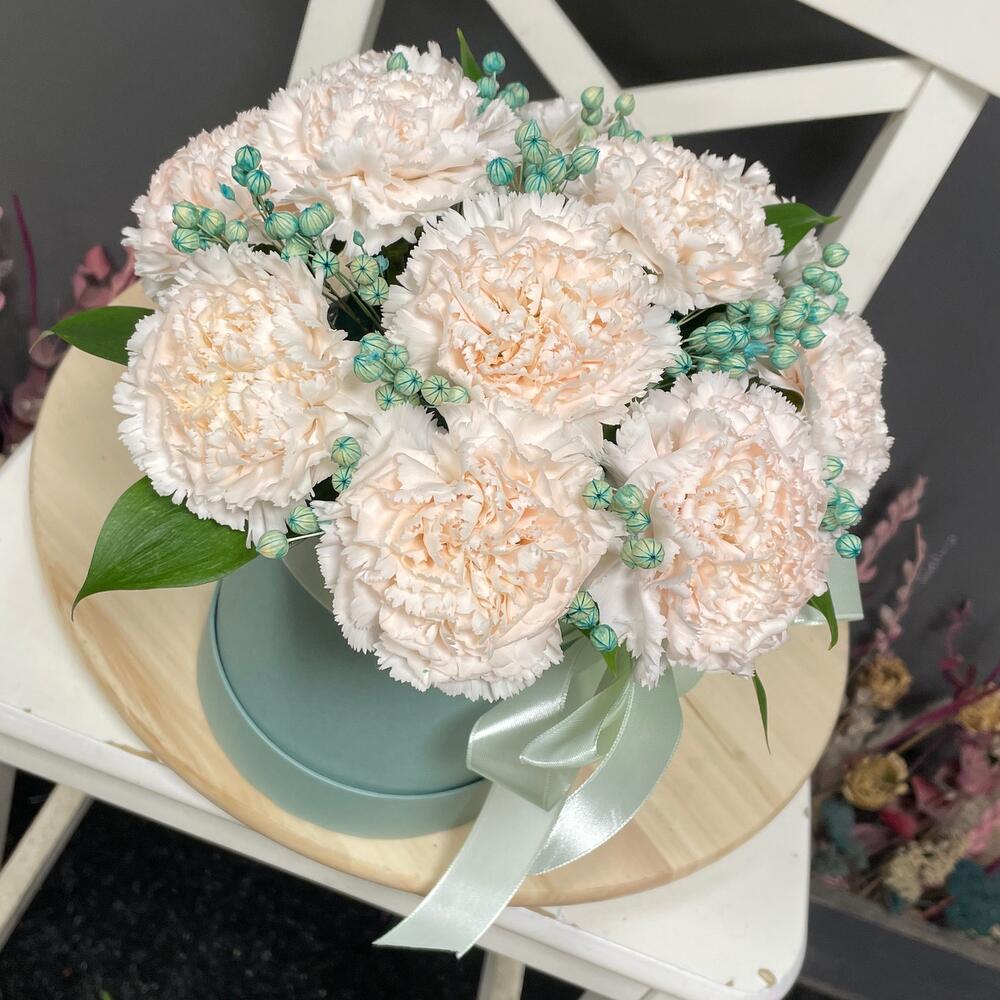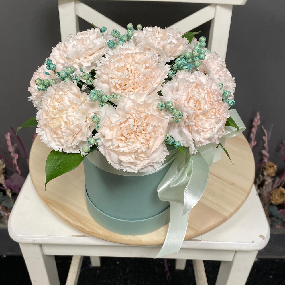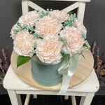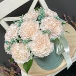 Композиция из нежных диантусов в шляпной коробке