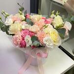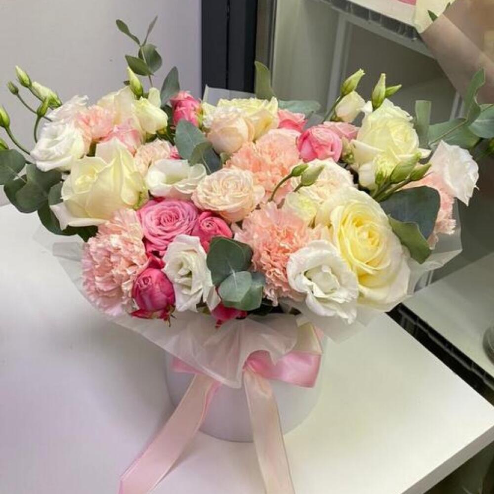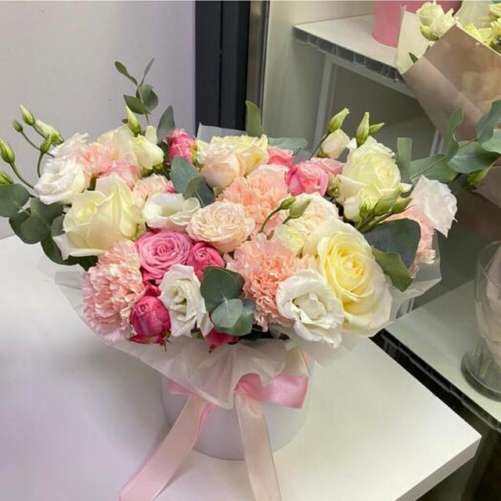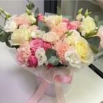 Эвкалипт - 1 шт. Кустовая роза - 3 шт. Лента атласная - 1 шт. Диантус - 5 шт. Коробка шляпная - 1 шт. эустома белая - 3 шт.