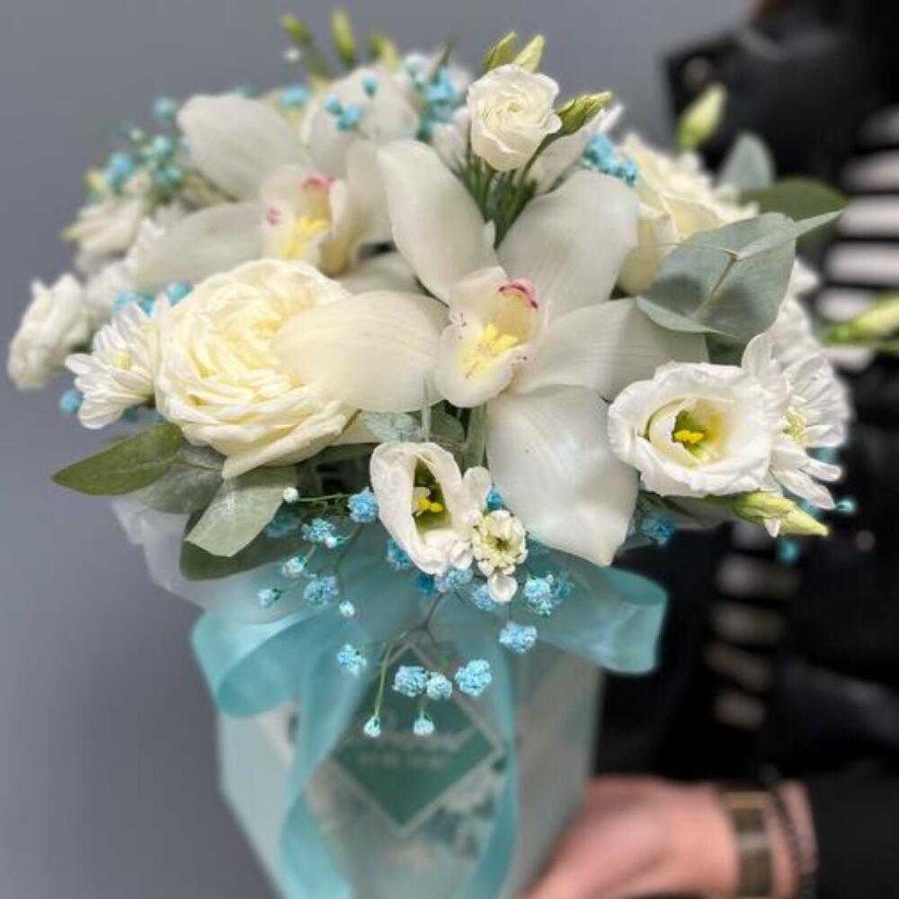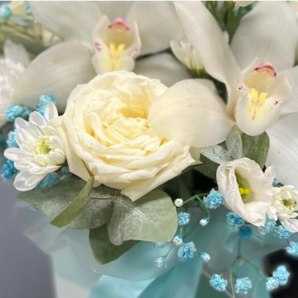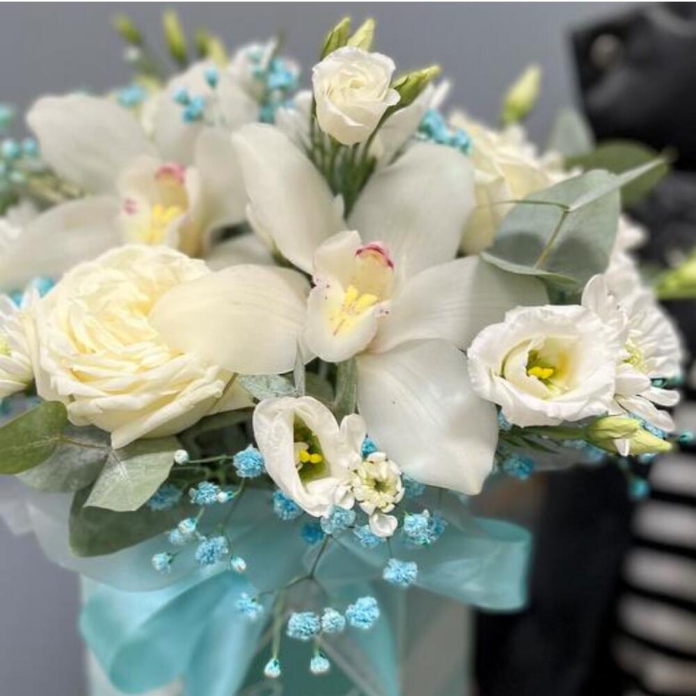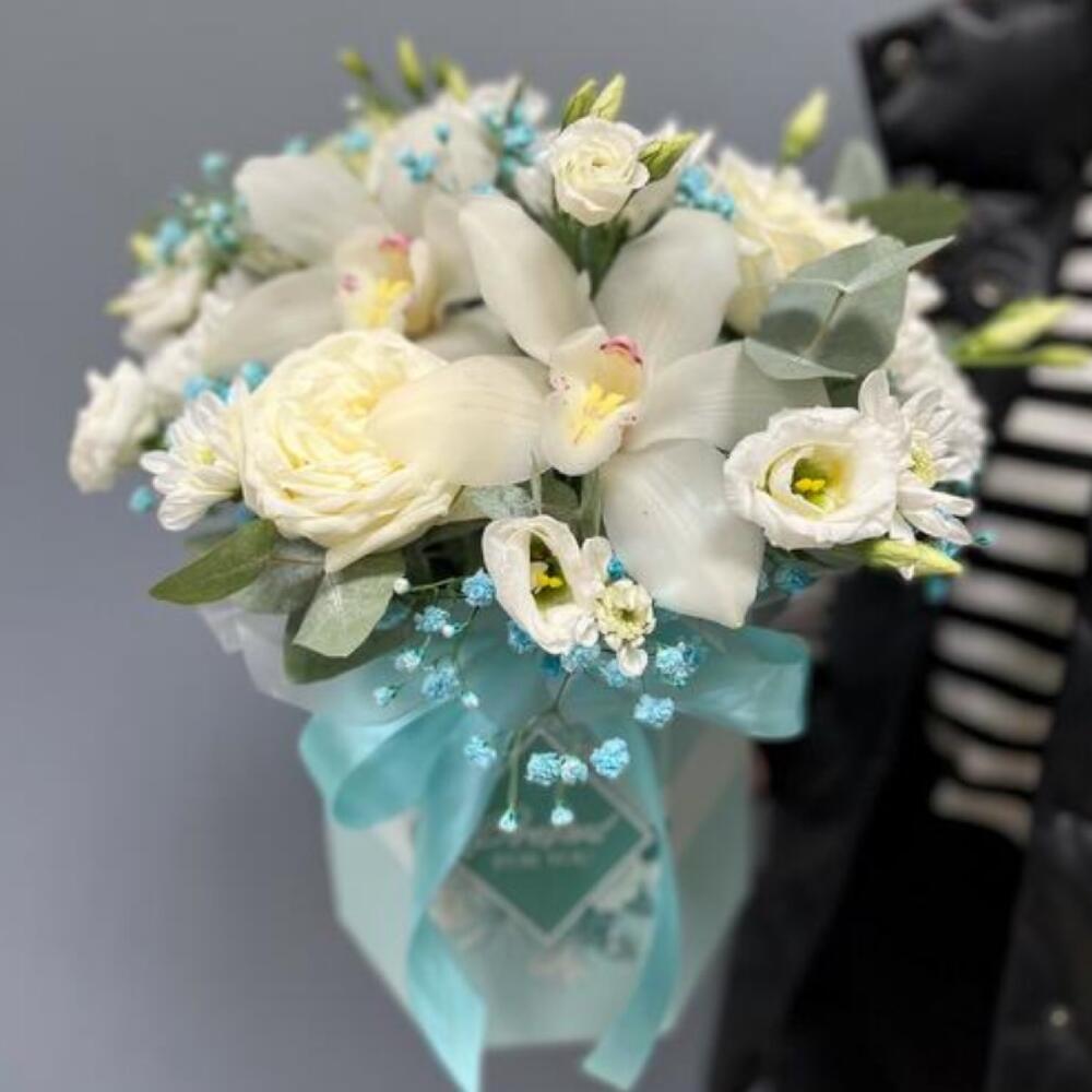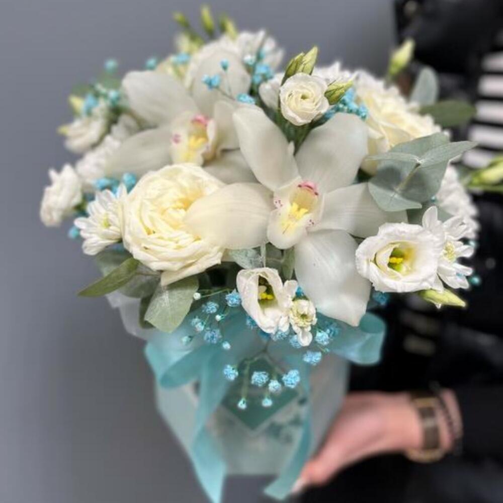 Гипсофила - 2 шт. Хризантема кустовая - 3 шт. Зелень - 2 шт. Лента атласная - 1 шт. Роза белая - 3 шт. Коробка - 1 шт. Лизиантус Белый - 5 шт. Оазис флористический - 1 шт. Цимбидиум белый - 2 шт. колбы для орхидея - 2 шт.