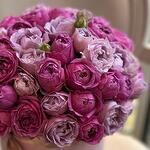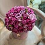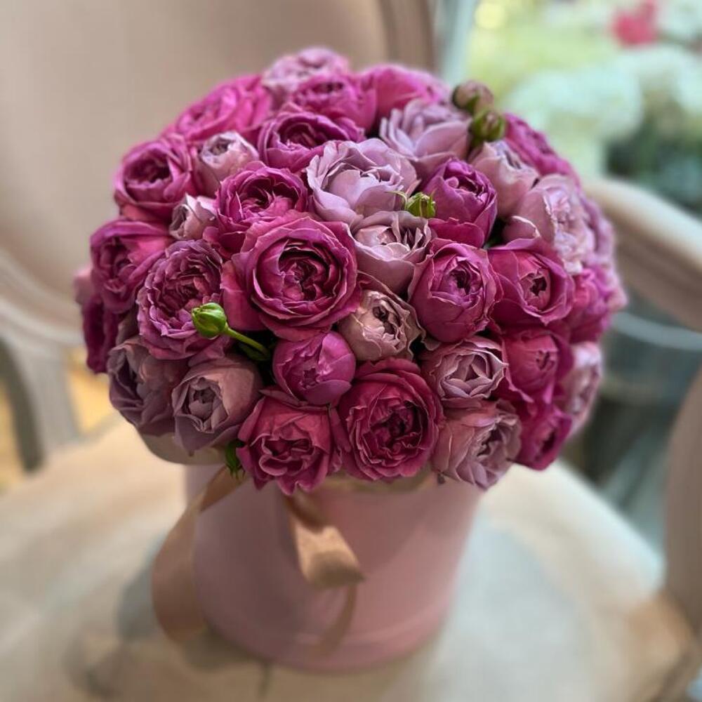Лента атласная - 1 шт. Коробка шляпная - 1 шт. пионовидная кустовая роза лаванда баблс - 10 шт. пионовидная роза кустовая мисти - 5 шт.