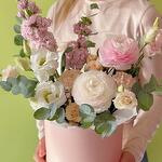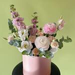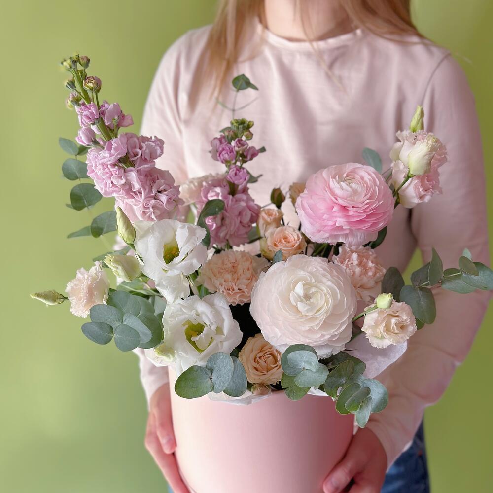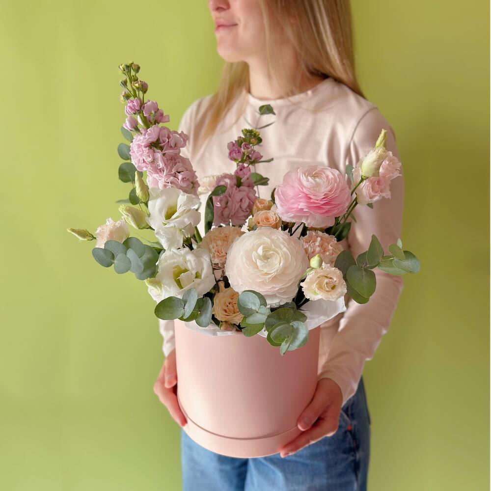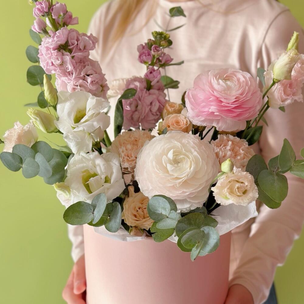 Цветы в коробке «Цветущий сад» с ранункулюсами и маттиолой