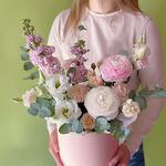 Воздушная композиция с сезонными стойкими диантусами, эустомой, эвкалиптом в нежных розовых оттенках. В составе также желанный цветочек - ранункулюс. Цветочная композиция в коробке удобна в транспортировке и уходе - цветы не нуждаются в ежедневном подрезании. Цветы находятся на влажной губке, которую необходимо периодически поливать для продления жизни цветам по мере высыхания верхнего слоя губки. Идеально для подарка маме