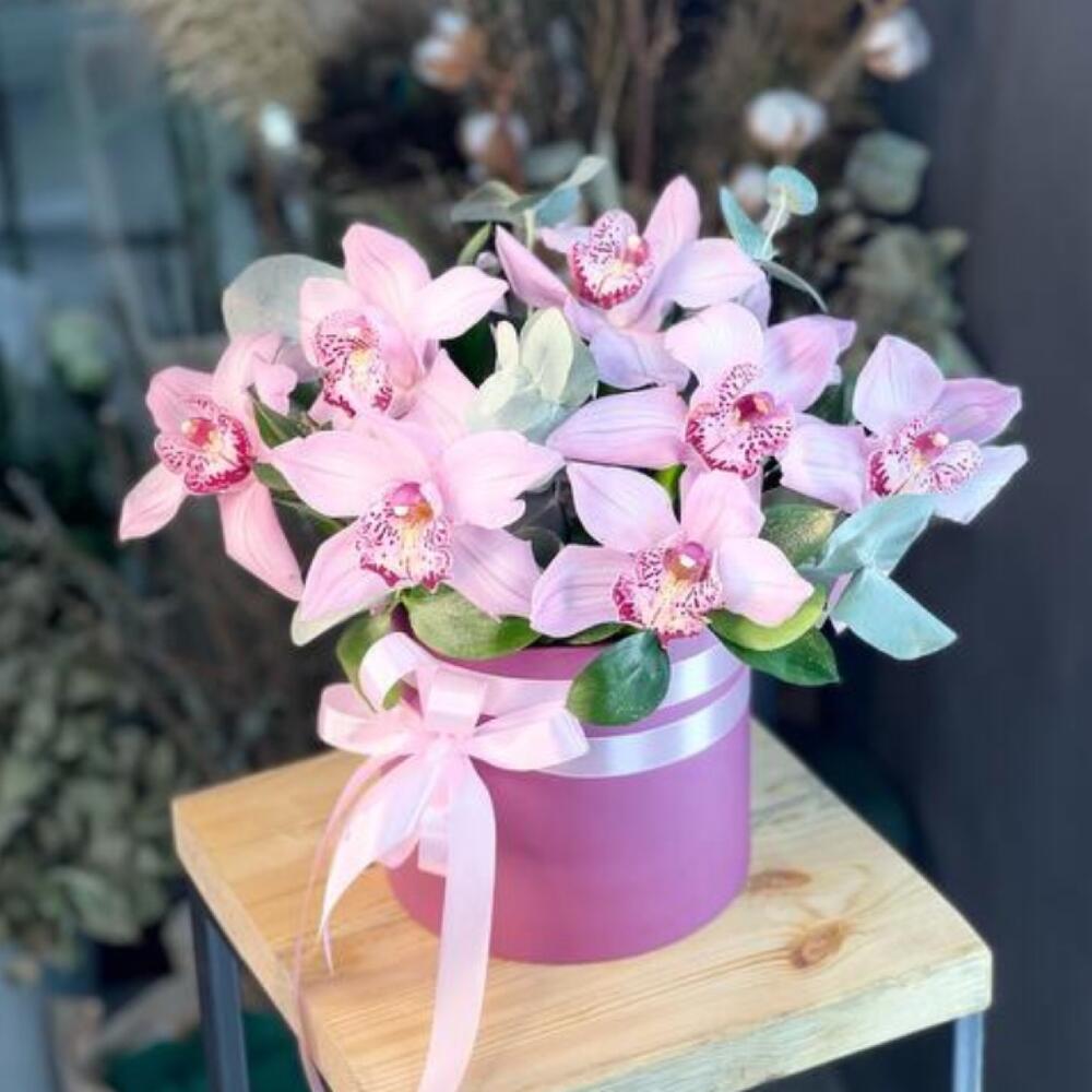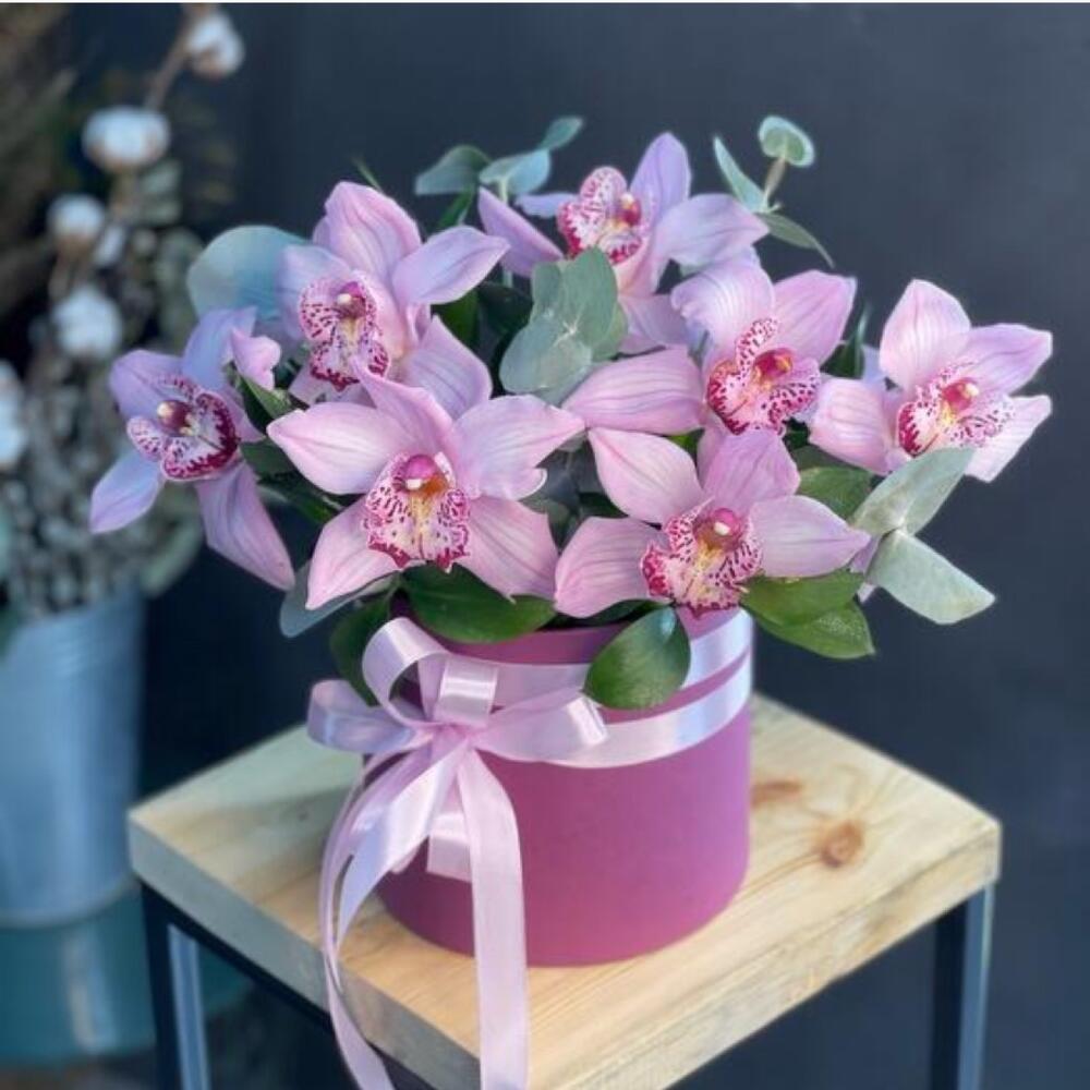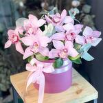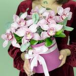 Лента атласная - 1 шт. Коробка - 1 шт. Оазис флористический - 1 шт. удлинитель для орхидеи - 7 шт. Цимбидиум розовый - 7 шт. зелень декоративная - 5 шт.