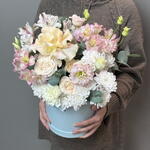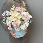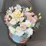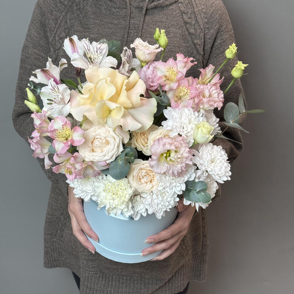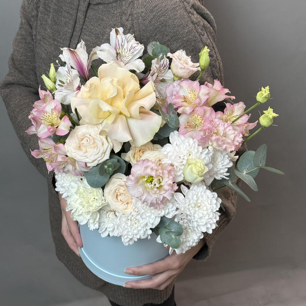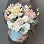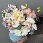 Микс из цветов в шляпной коробке. В составе композиции : воздушная хризантема, пушистая эустома, кустовая роза, альстромерия, французская роза и ароматный эвкалипт. Цветы в шляпной коробке удобно дарить. Букет в коробке не требует вазы, достаточно подливать воду раз в несколько дней и цветы долго будут радовать своей красотой и свежестью получательницу 🌸 Быстрая и бережная доставка 🚚