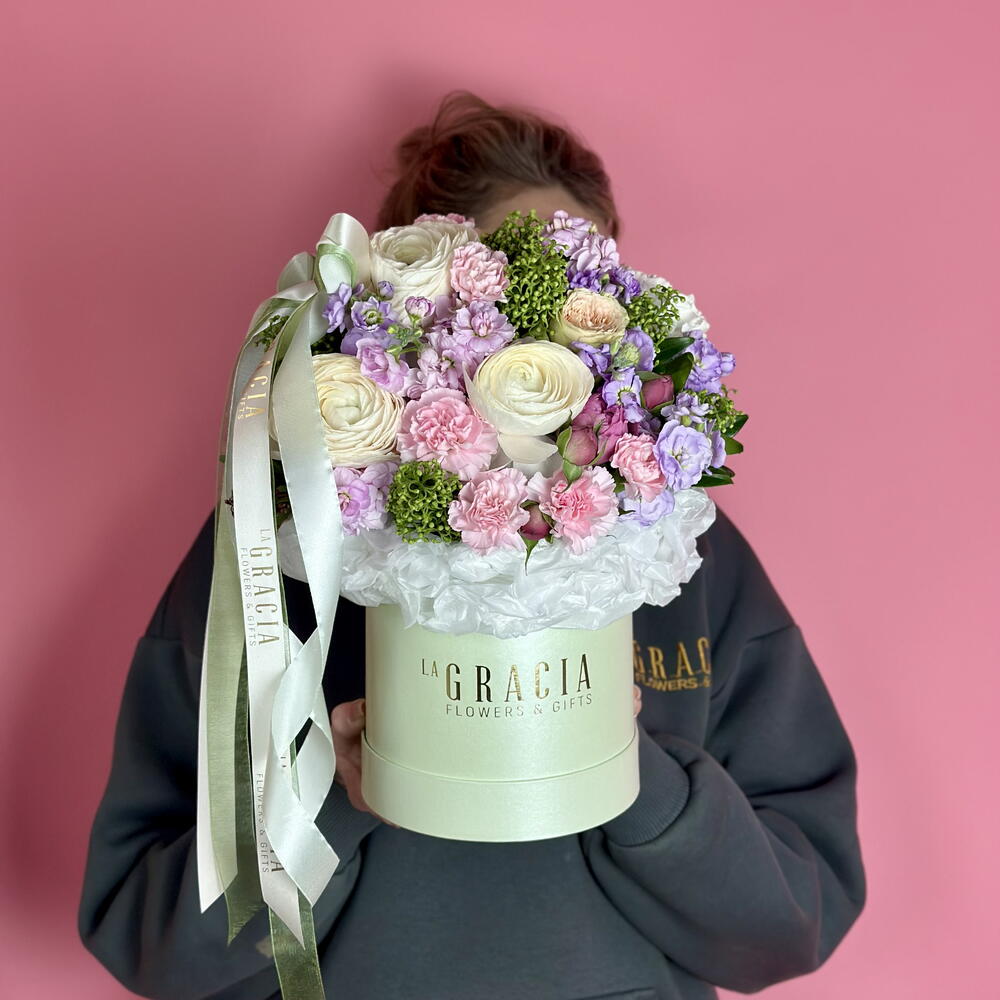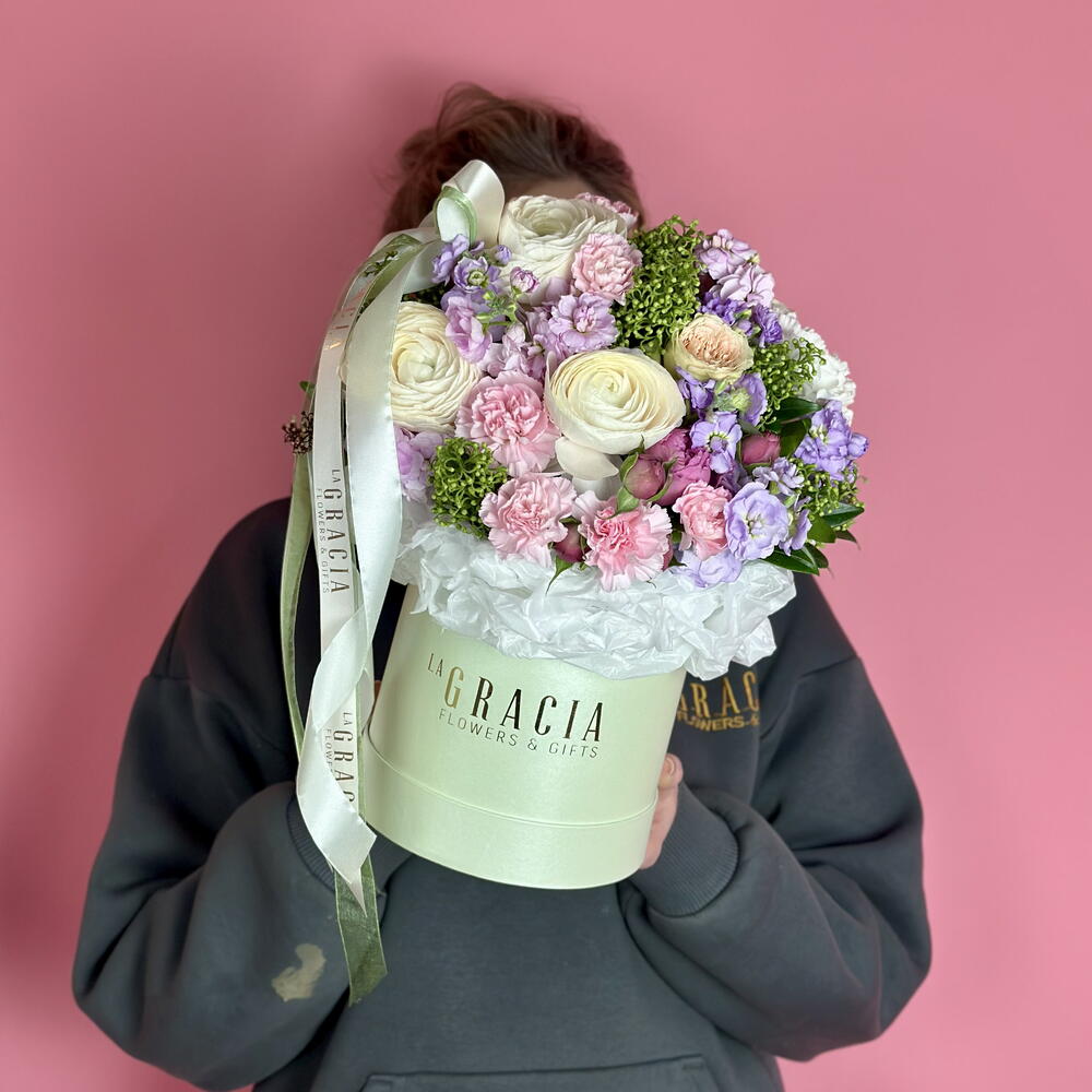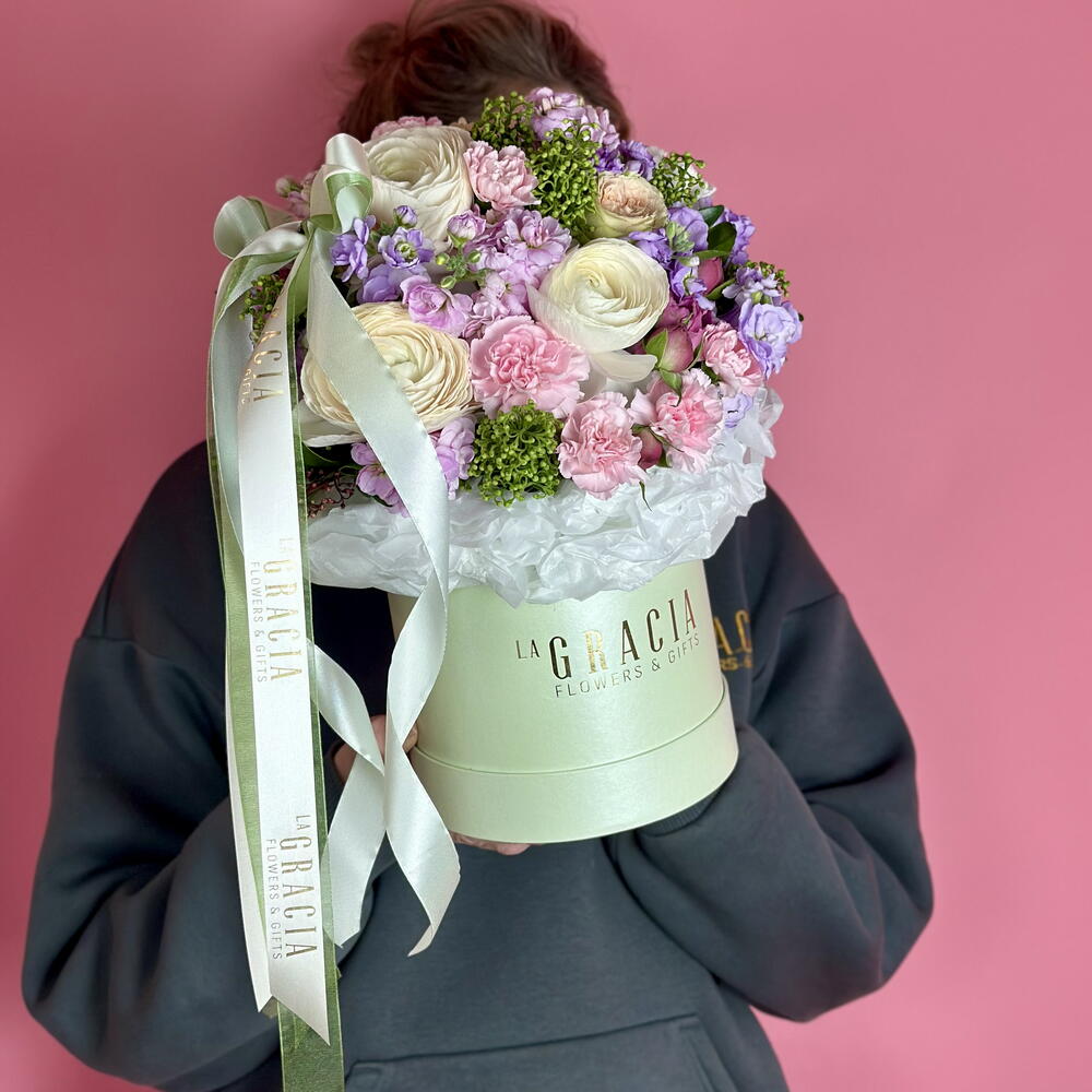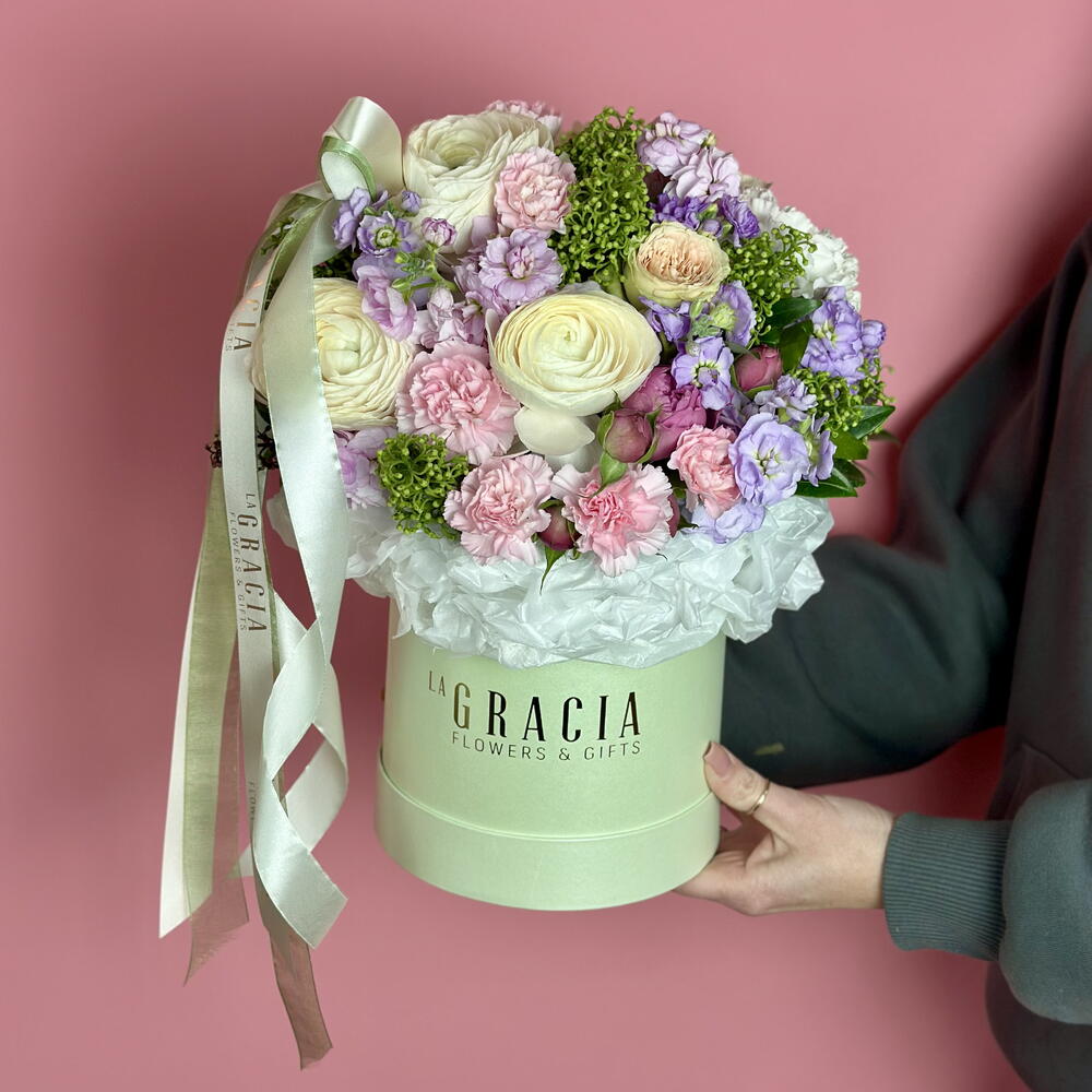 Цветы в коробке. Фисташковая композиция из ранункулюса и акцента из скимии. Коробка с золотым логотипом La Gracia, бумага тишью, бант с маленькой брошкой - это фирменный стиль нашего бренда! Цветы стоят в увлажненной флористической губке. Средство для продления жизни цветов добавьте в 1 литр свежей воды, размешайте. Надо подливать небольшое количество ежедневно на губку и цветы будут радовать свежестью. Цветы в коробке удобно дарить и транспортировать, для них не нужна ваза.