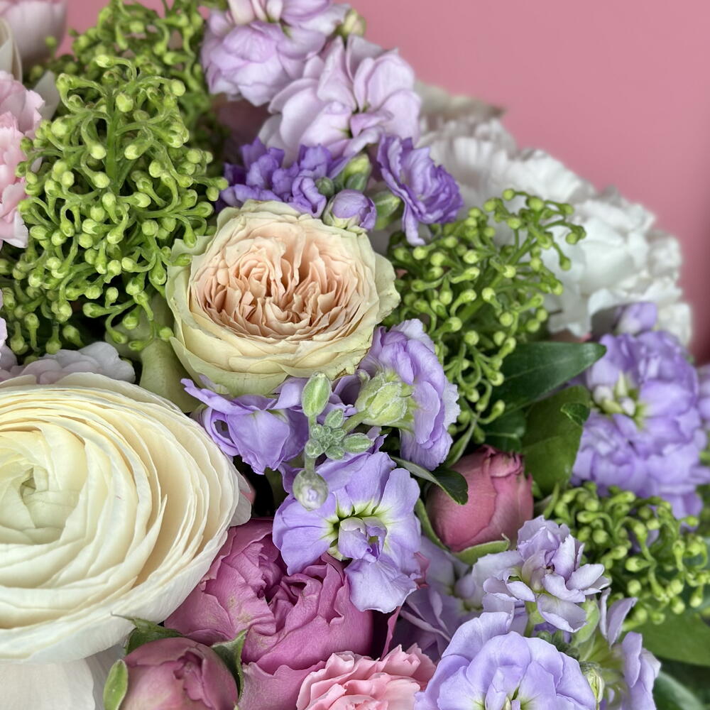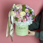 Гортензия - 1 шт. Маттиола - 7 шт. Диантус - 1 шт. Ранункулюс - 3 шт. Скиммия - 1 шт.