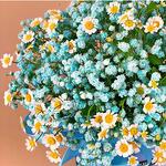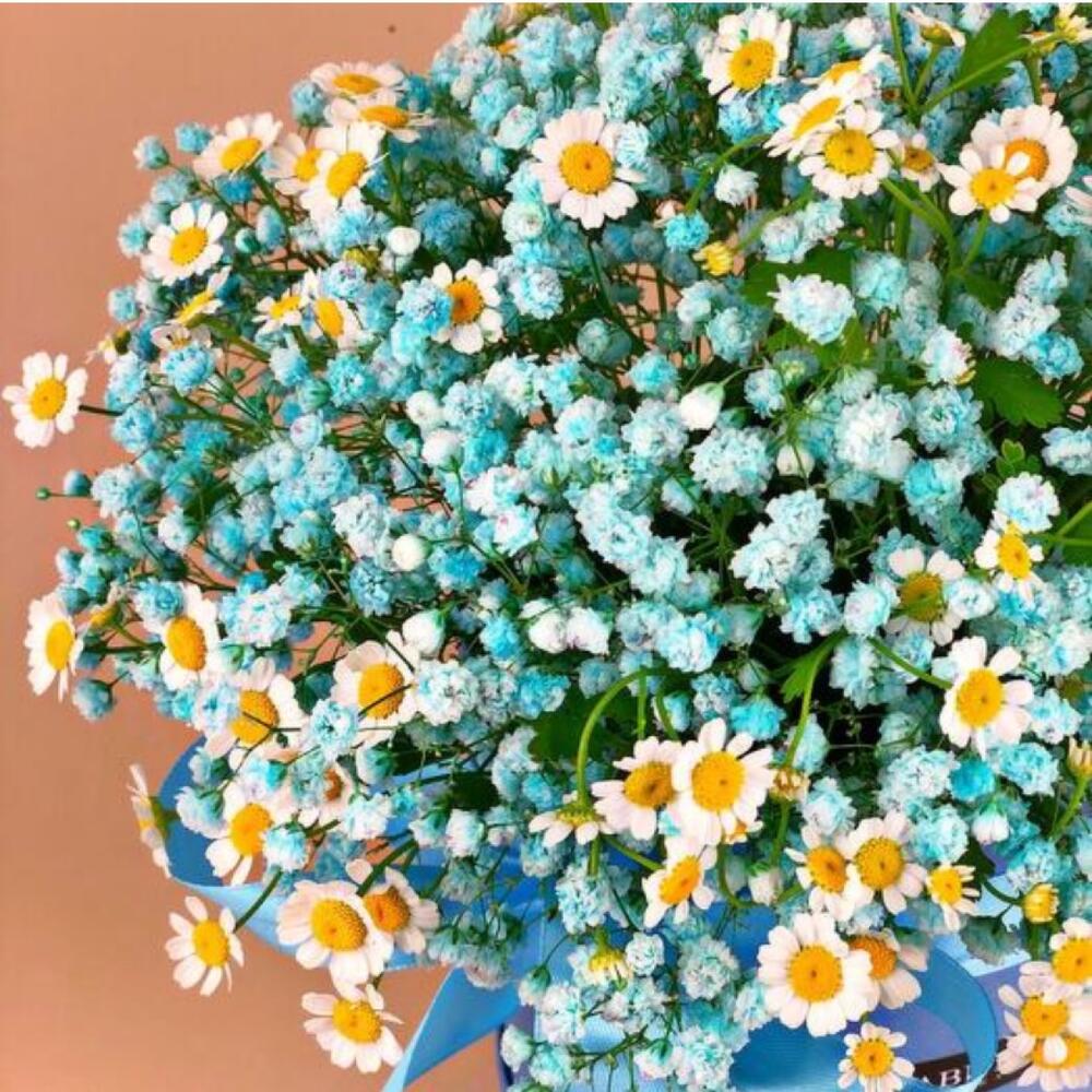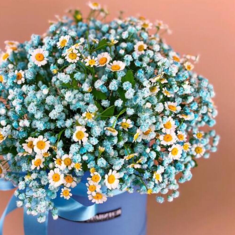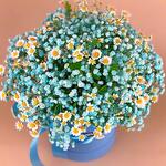 Лента атласная - 1 шт. Коробка - 1 шт. Танацетум камилла - 5 шт. Оазис флористический - 1 шт. Гипсофила голубая - 7 шт. зелень декоративная - 3 шт.