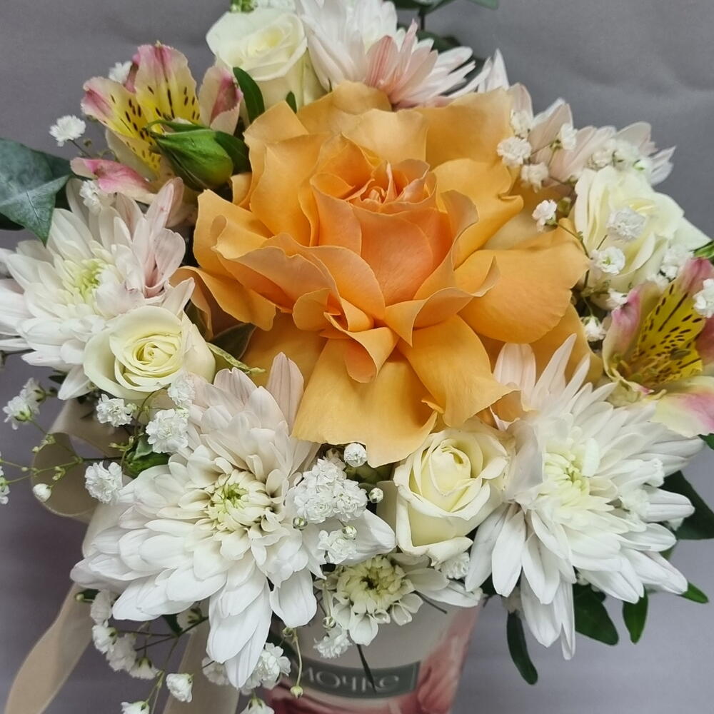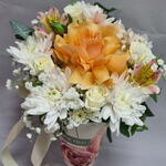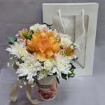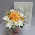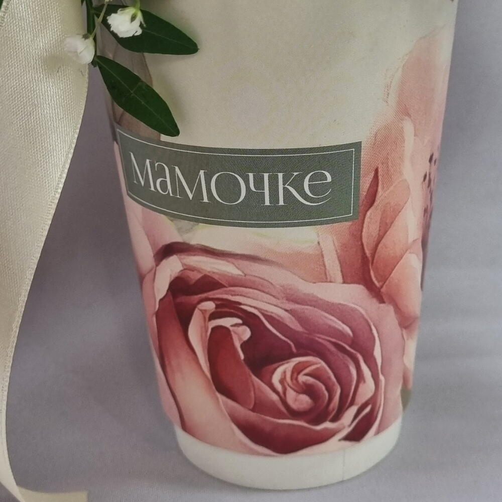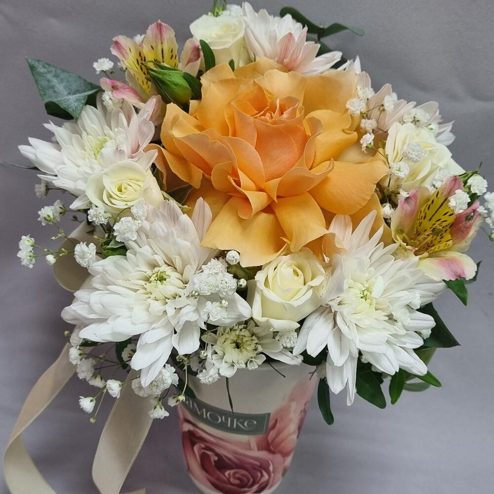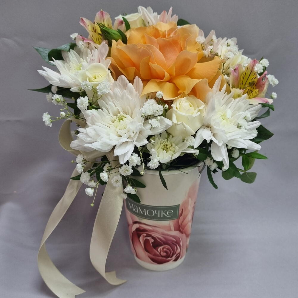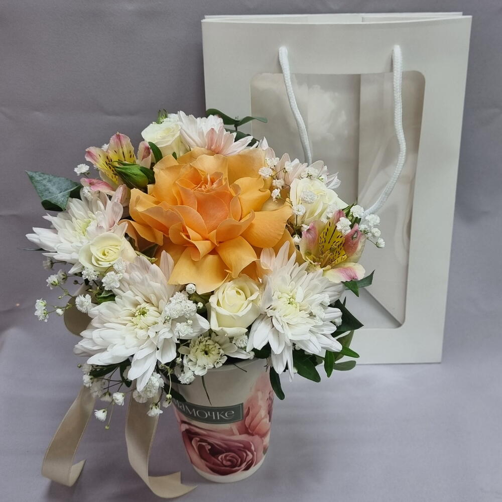 Альстромерия - 1 шт. Гипсофила - 1 шт. Роза кустовая - 1 шт. Хризантема кустовая - 1 шт. Эвкалипт - 2 шт. Фисташка - 1 шт. Роза французская - 1 шт. Оазис флористический - 1 шт. пакет подарочный с окном - 1 шт. стакан с надписью мамочке - 1 шт.