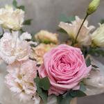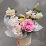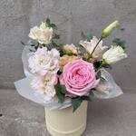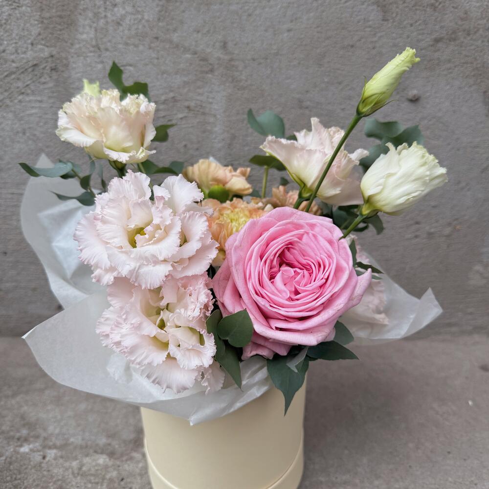 Маленькая коробочка из нежных цветов: розы, лизиантусов, эустомы и эвкалипта отлично подойдет в качестве комплимента и дополнения к основному подарку близкому человеку: маме, бабушке, жене,дочери,любимой девушке.
