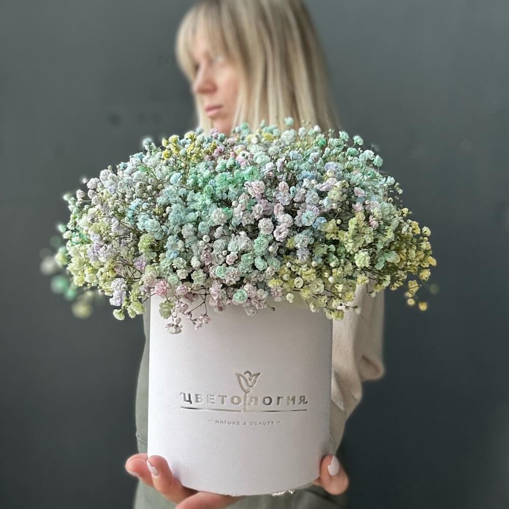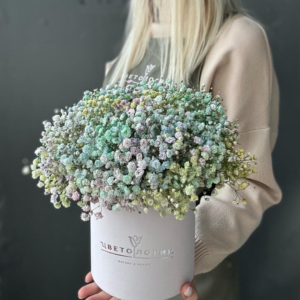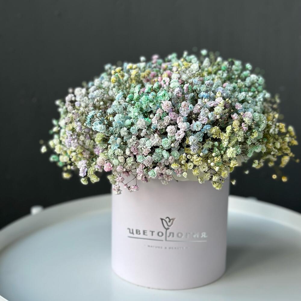 Коробка шляпная - 1 шт. Оазис флористический - 1 шт. гипсофила радужная - 9 шт.