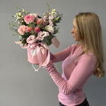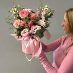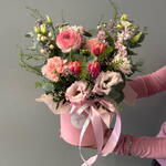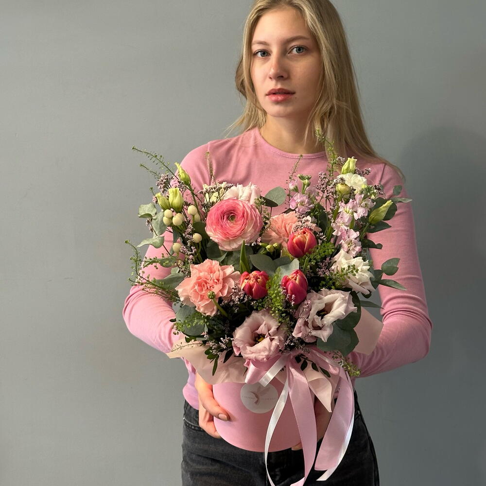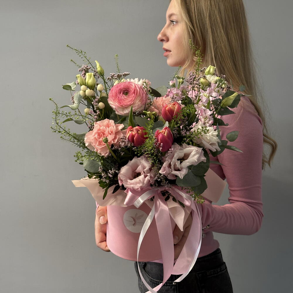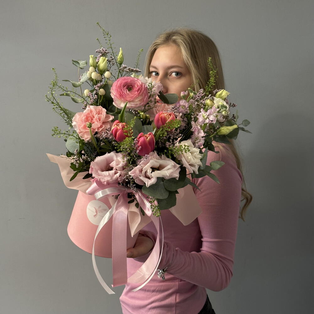 Гиперикум - 1 шт. Маттиола - 2 шт. Эвкалипт - 2 шт. Эустома - 3 шт. Лента атласная - 2 шт. Диантус - 2 шт. Шляпная коробка - 1 шт. Тюльпан пионовидный - 3 шт. Гринбелл - 3 шт. Губка флористическая - 1 шт. Ранункулус - 1 шт.