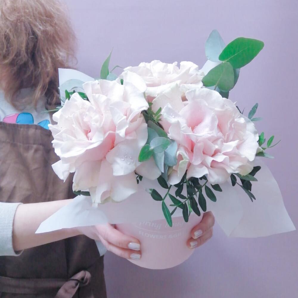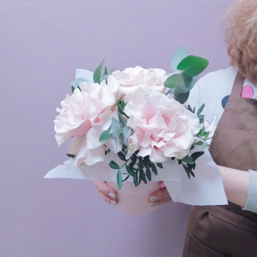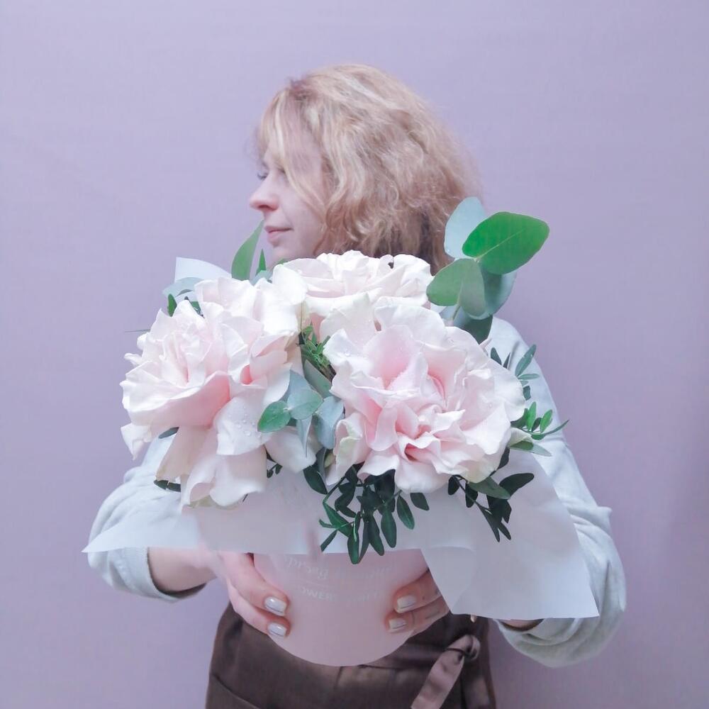 Цветы в коробке с французскими розами и эвкалиптом