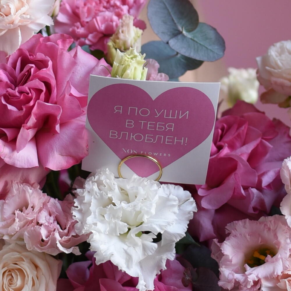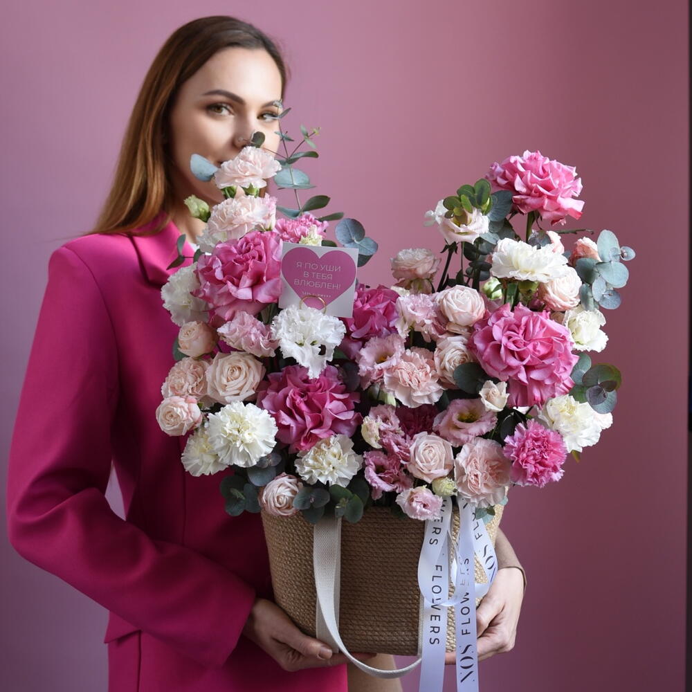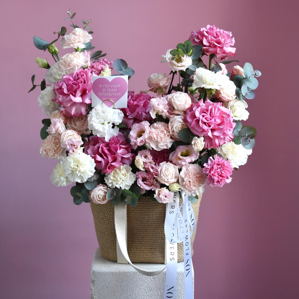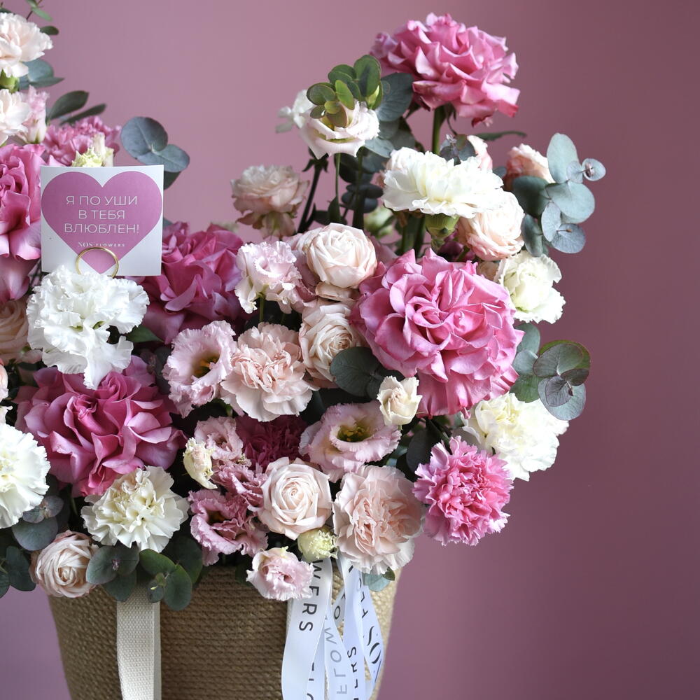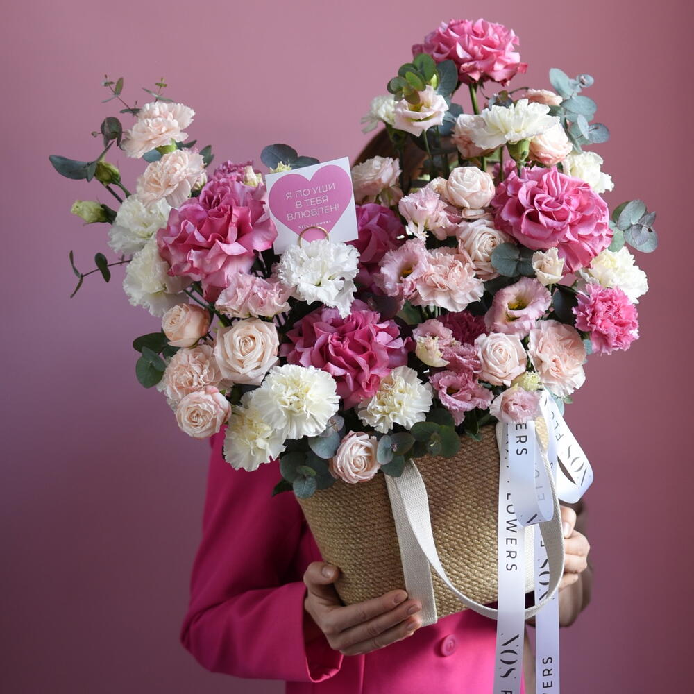 Композиция «я тебя 💓» Бежевая плетёная корзина с тканевыми ручками — тёплая, домашняя, такая, которую хочется поставить на стол и не выпускать из рук. Внутри — целое сердце нежности. Кремовые и бледно-розовые французские розы раскрываются медленно, важно, будто знают себе цену. Рядом — пушистые кустовые, мелкие, трогательные, их хочется касаться губами. Лизиантусы смотрят из глубины бутона удивлённо и чисто. Их лепестки полупрозрачны, как папиросная бумага, как обещание, сказанное шёпотом. Диантус рассыпан невесомой розовой пудрой — тихо, но так уютно. И эвкалипт. Серебристо-дымчатый, пушистый, он вплетается между цветами, как спокойное дыхание. Его аромат — чуть смолистый, свежий, успокаивающий. Всё это — не про яркость. Это про утро, когда не надо спешить. Про чай в любимой чашке. Про человека, рядом с которым можно молчать и чувствовать тепло. Внутри — наша фирменная открытка. Чистая, плотная, с тиснением. Для тех слов, которые нельзя отправить в мессенджере. Для тех слов, которые пишутся медленно и от руки. Это не букет. Это тихое «я тебя люблю». Без повода. Просто потому, что ты есть. --- Если хочешь, могу сделать: · акцент на «корзину как подарок с историей», · более лёгкий вариант для Instagram, · или версию, где открытка становится главным героем.