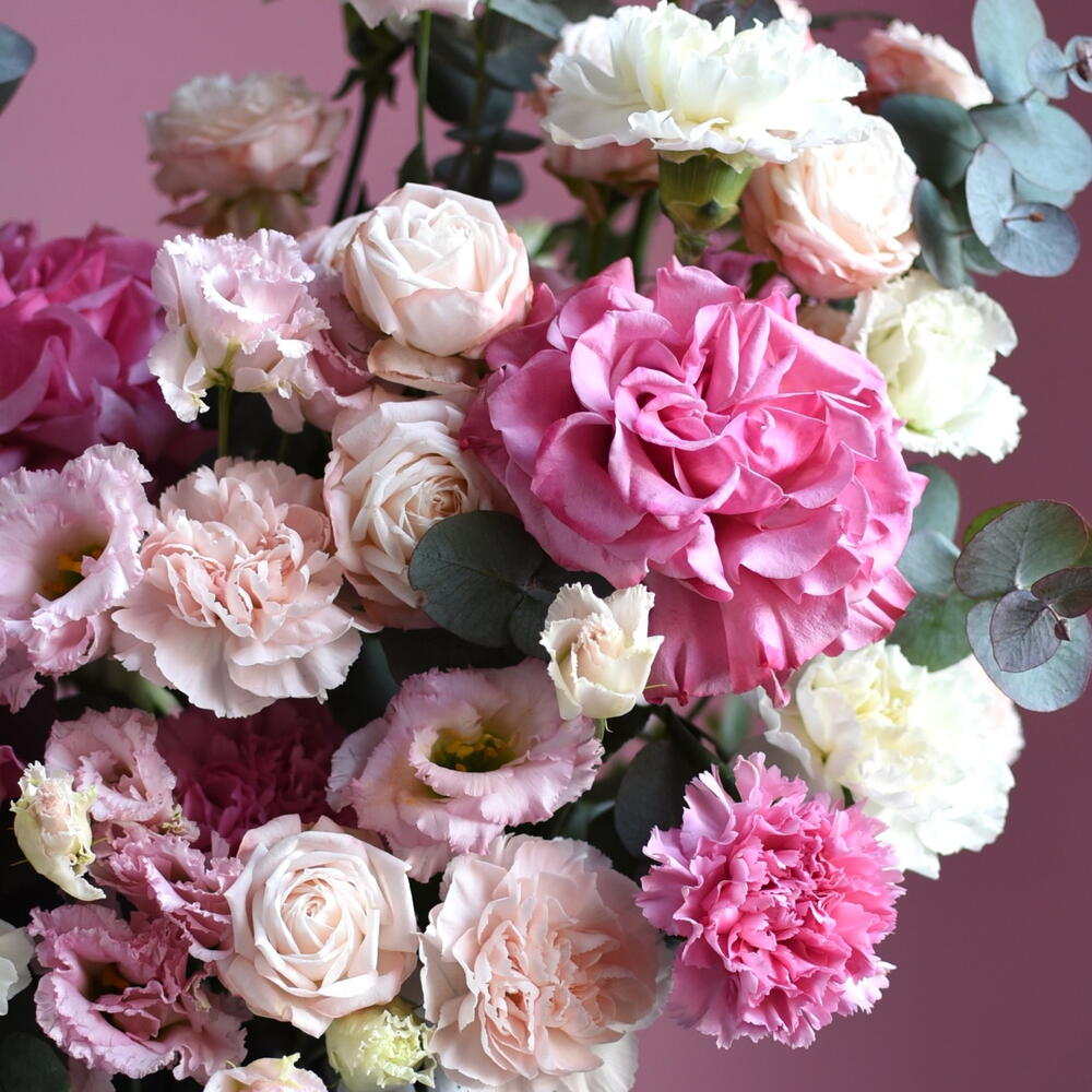 Лизиантус - 4 шт. Кустовая роза - 3 шт. Диантус - 15 шт. Корзина плетеная - 1 шт. Французская роза - 5 шт. Эвкалипт Микс - 5 шт. открытка с вашими пожеланиями - 1 шт.