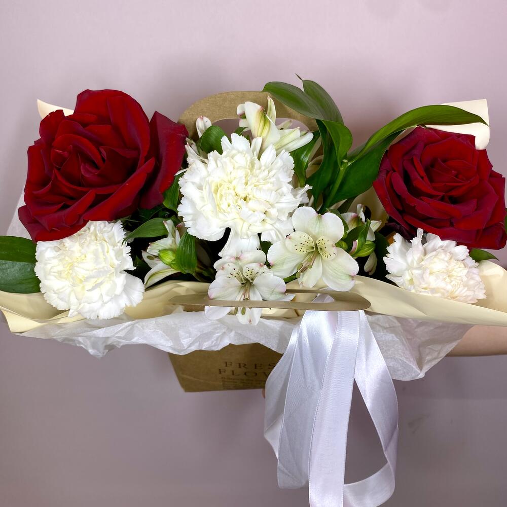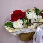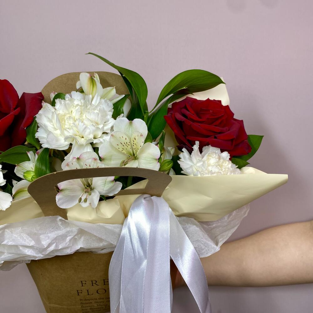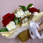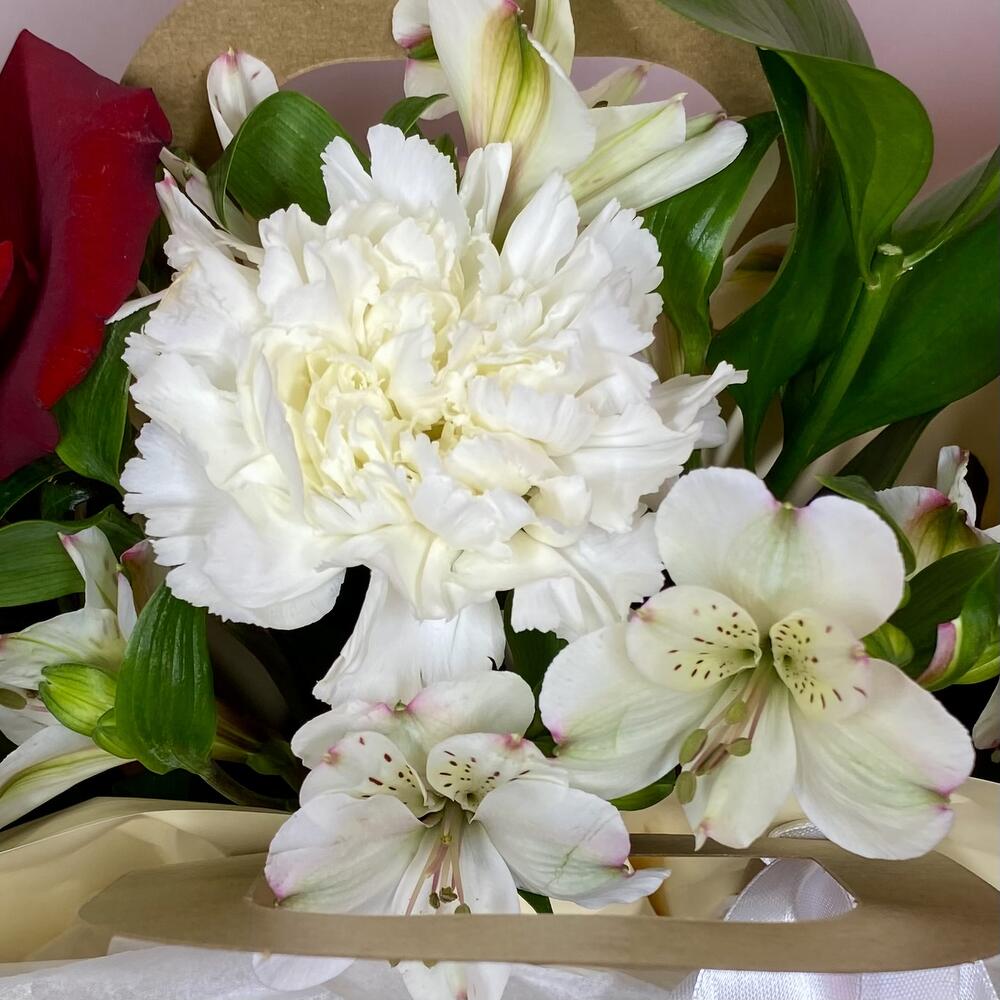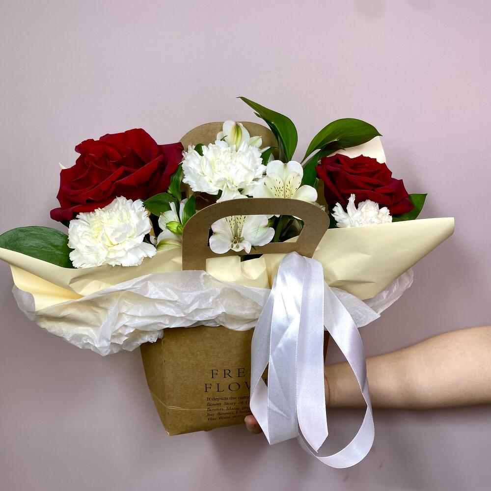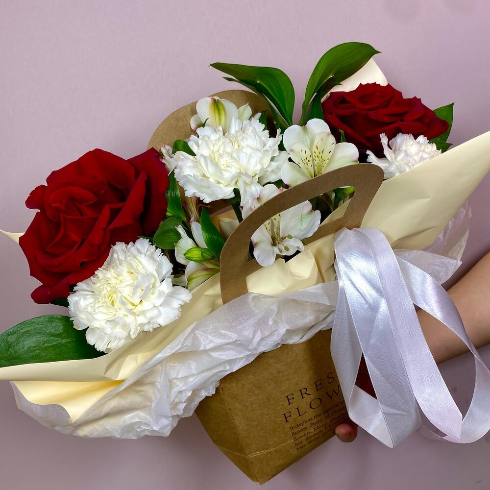Альстромерия - 1 шт. Рускус - 2 шт. Роза Эквадор - 2 шт. Лента атласная - 1 шт. Диантус - 3 шт. Пленка матовая - 1 шт. Оазис флористический - 1 шт. Сумочка картонная - 1 шт.
