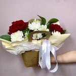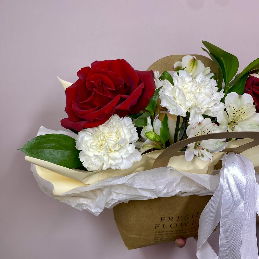 Цветочная композиция в картонной сумочке. Такой букет отлично подойдёт на любой праздник, будь то день рождения, юбилей, комплимент коллеги, маме, подруге, сестре, свадьба или 8 марта.