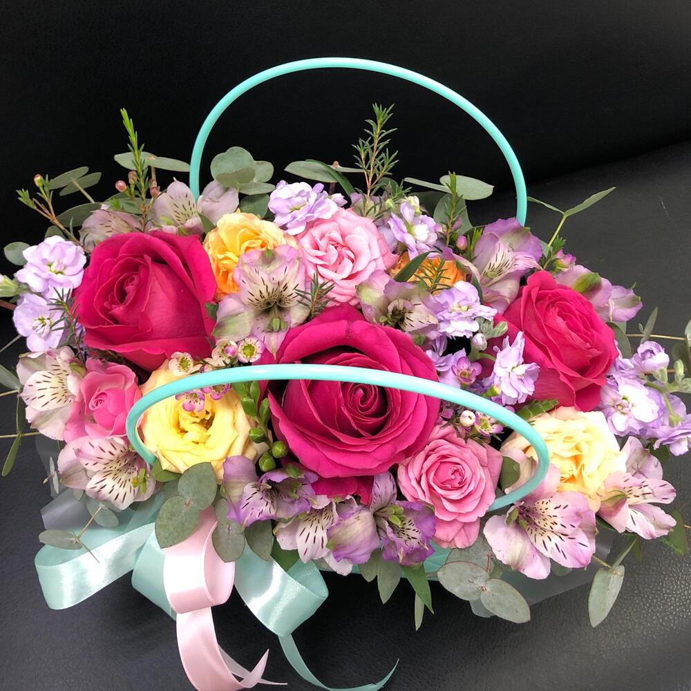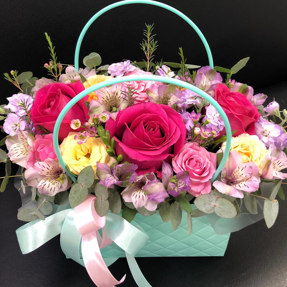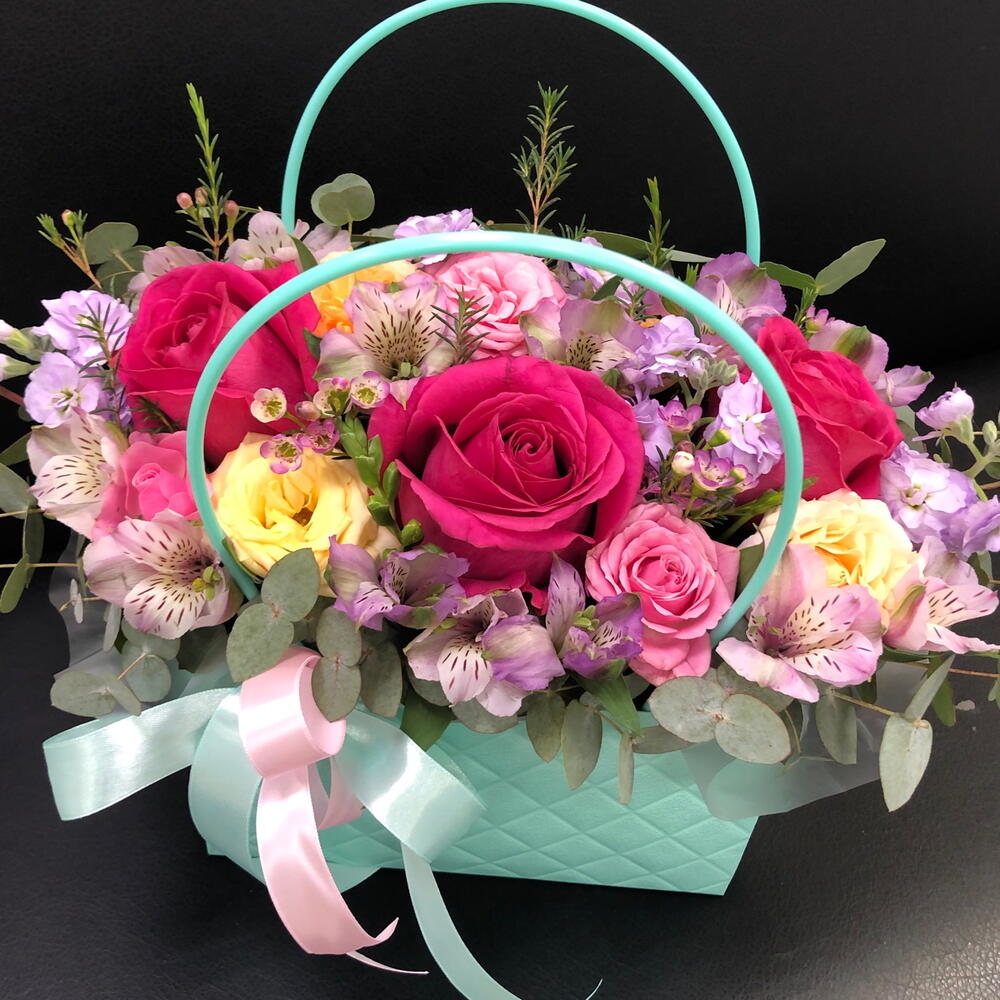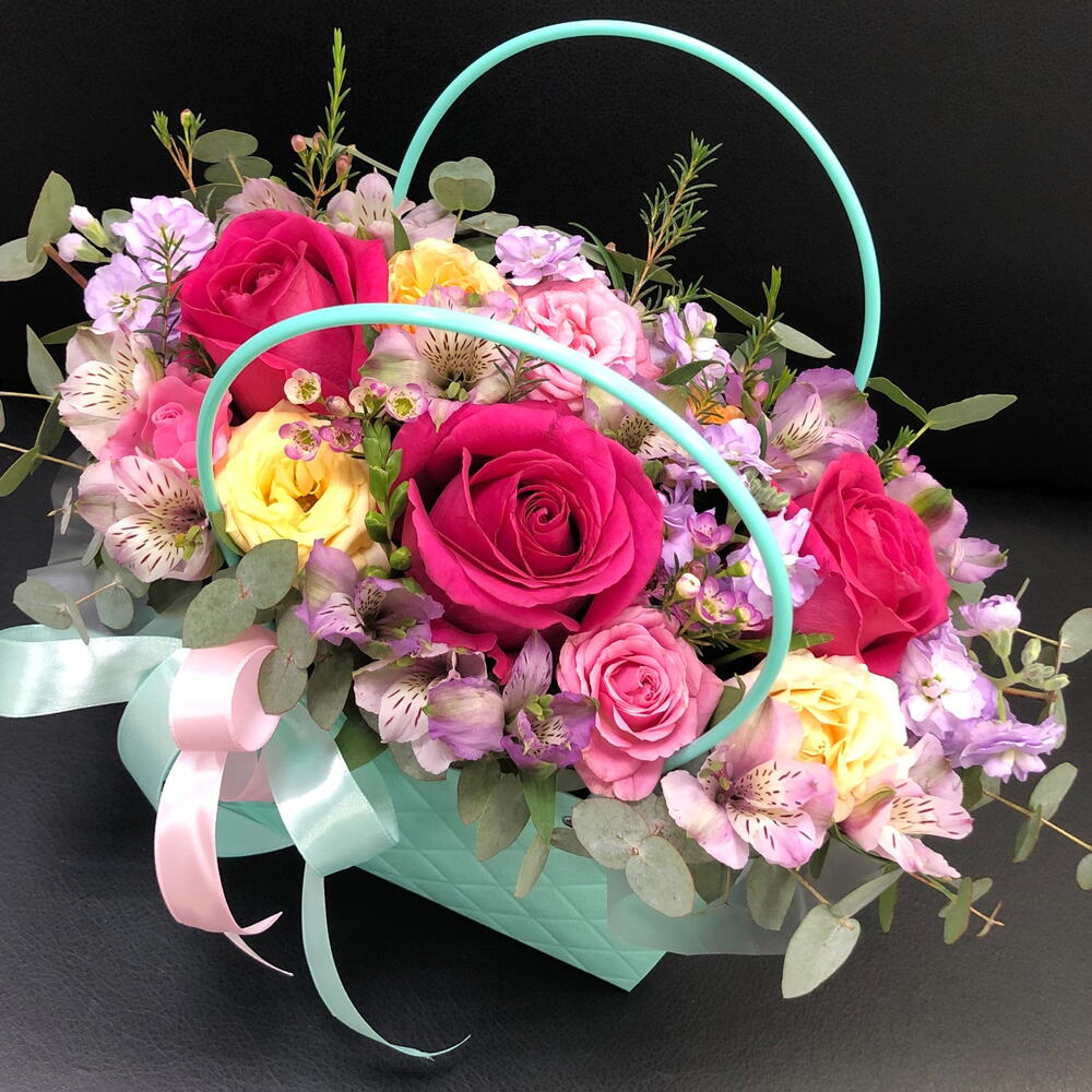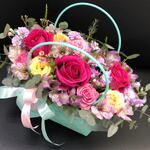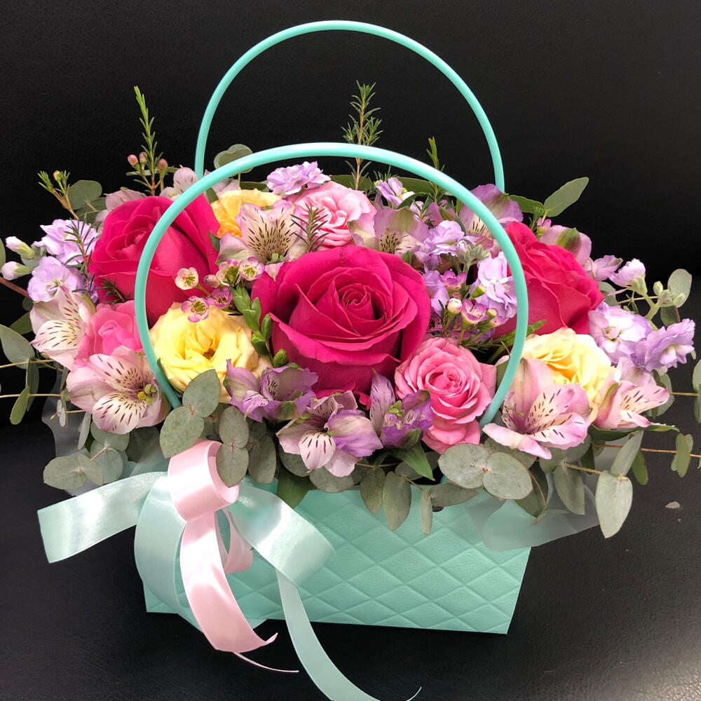 Альстромерия - 3 шт. Лента - 2 шт. Маттиола - 1 шт. Роза кустовая - 2 шт. Эвкалипт - 1 шт. Роза - 3 шт. Оазис - 1 шт. Хамелациум - 1 шт. Сумочка - 1 шт.