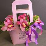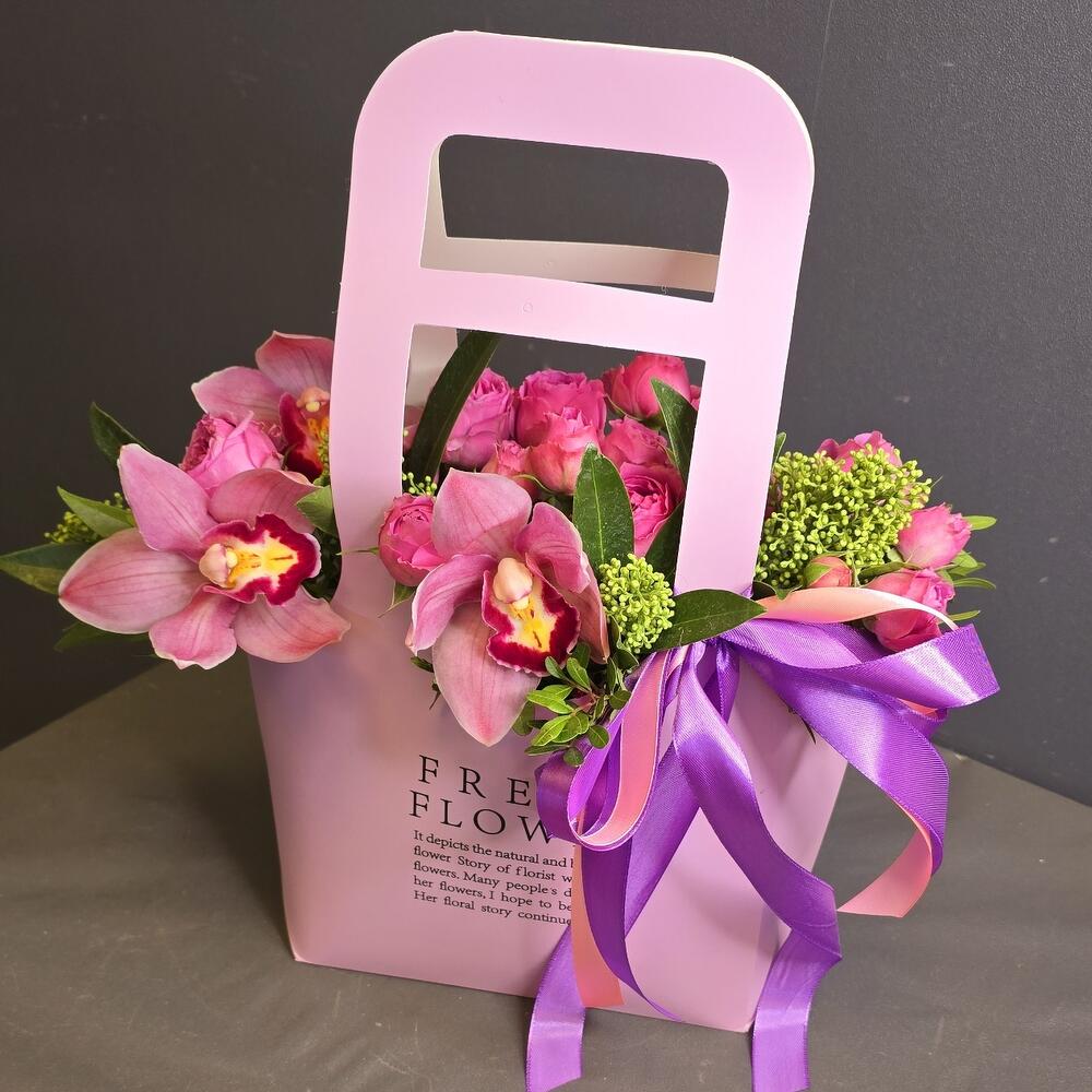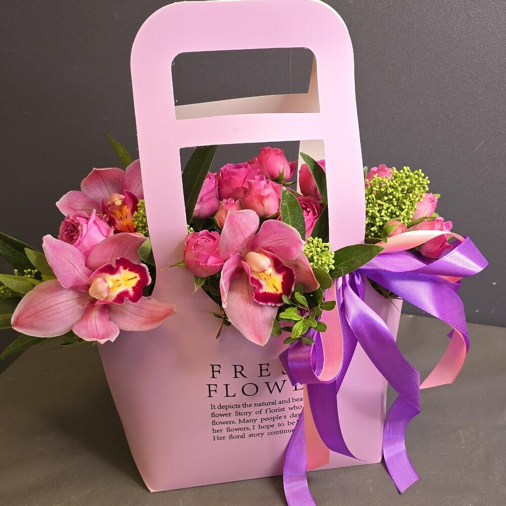 Орхидея Цимбидиум - 3 шт. Лента атласная - 3 шт. Роза кустовая пионовидная - 4 шт. Скиммия - 1 шт. сумка картон с ручками - 1 шт.